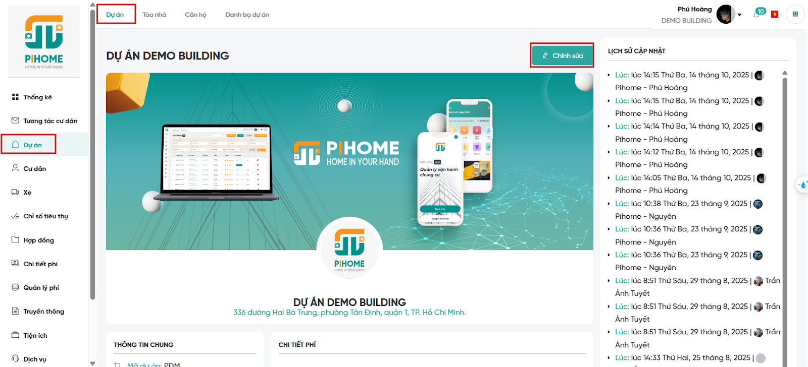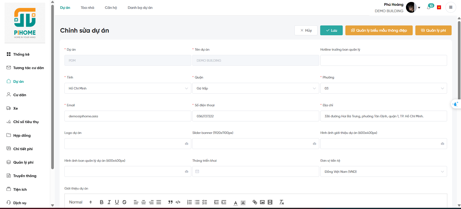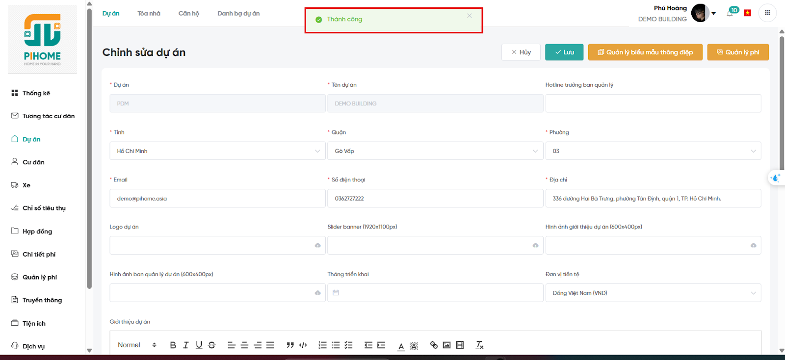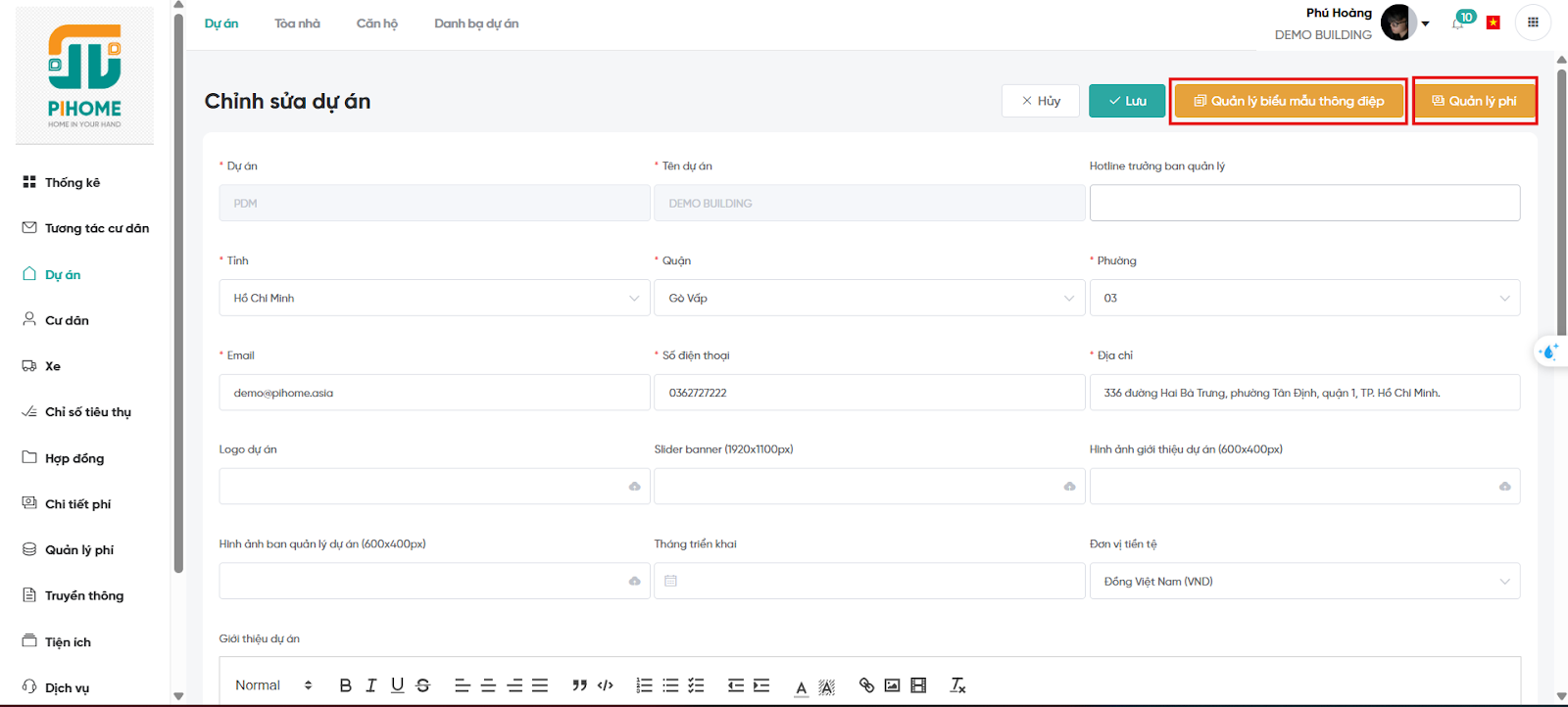 Chức năng này cho phép người dùng nhập đầy đủ thông tin dự án, giúp việc quản lý trở nên logic và hiệu quả hơn. Sau khi cài đặt, Ban quản lý có thể xem tổng quan, chỉnh sửa hoặc bổ sung dữ liệu bất kỳ lúc nào.