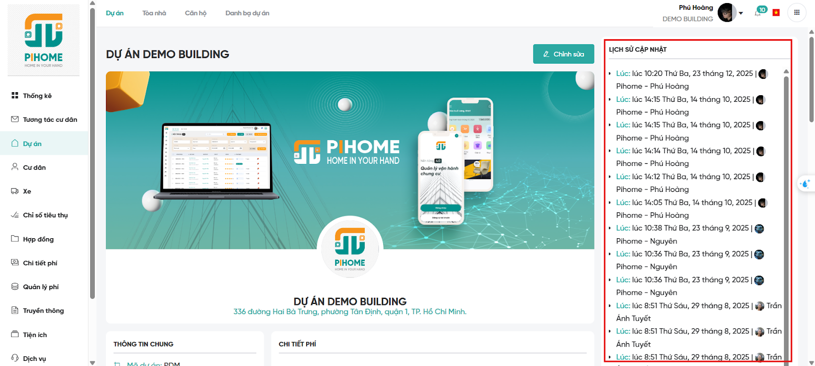 Người dùng có thể xem thông tin chi tiết lịch sử cập nhật của dự án ở cột thông tin bên phải dự án.