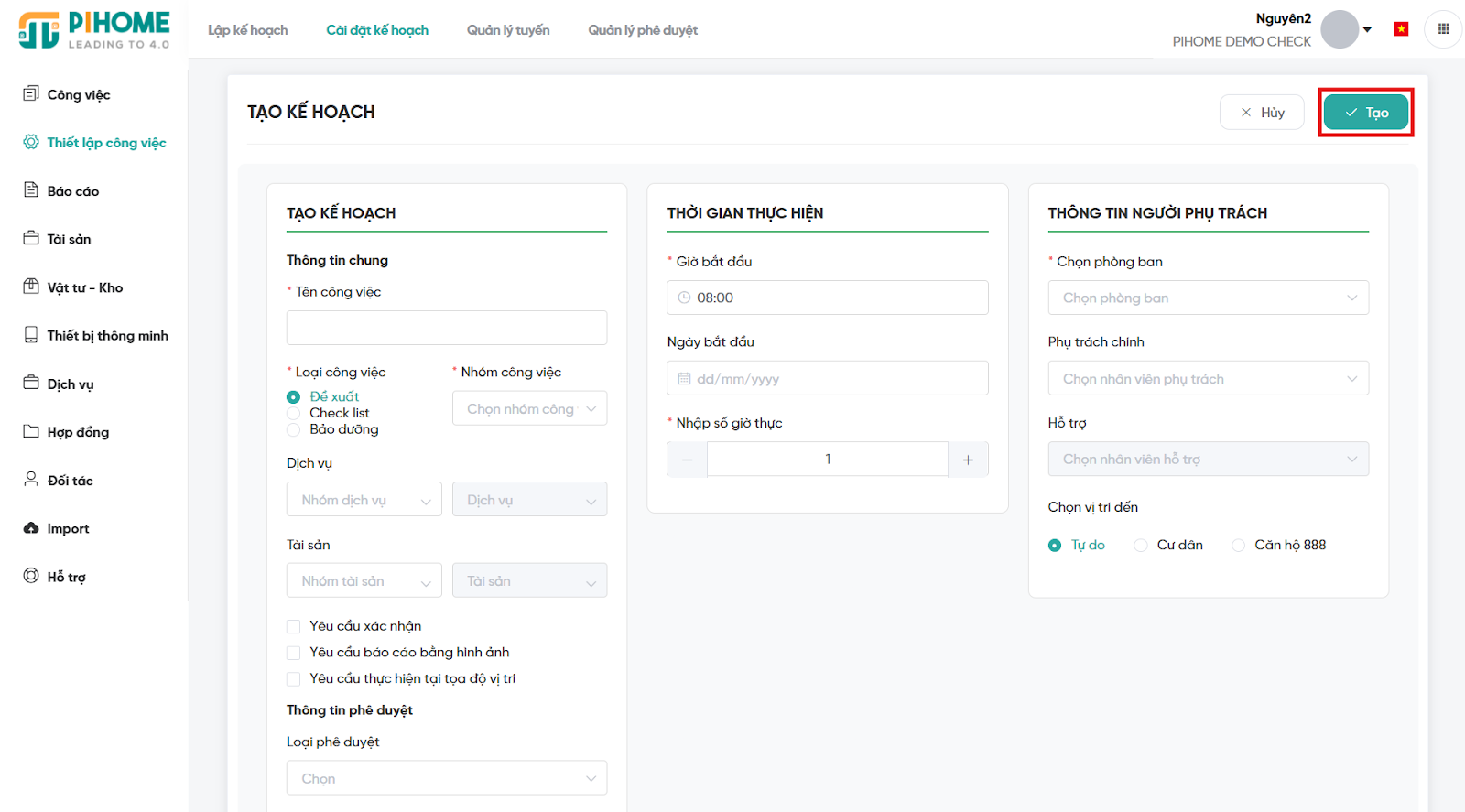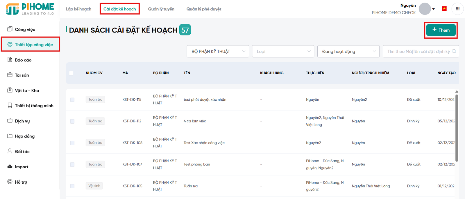 Bước 1: Tại phân hệ “Vận hành” → “Thiết lập Công việc” trên thanh sidebar bên trái → Chọn “Cài đặt kế hoạch” → Nhấn “Thêm” để hệ thống chuyển đến giao diện Tạo kế hoạch.