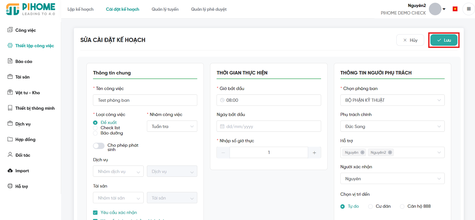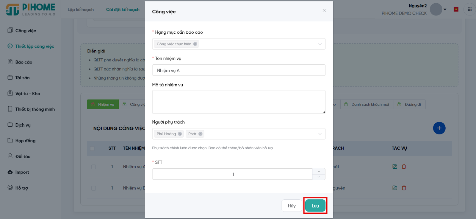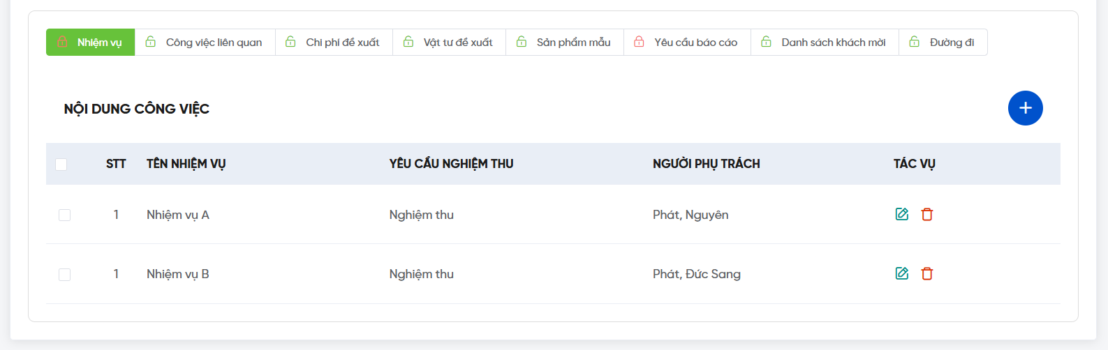 - Phân công nhân sự: chọn phòng ban, người phụ trách chính, người hỗ trợ, người xác nhận…