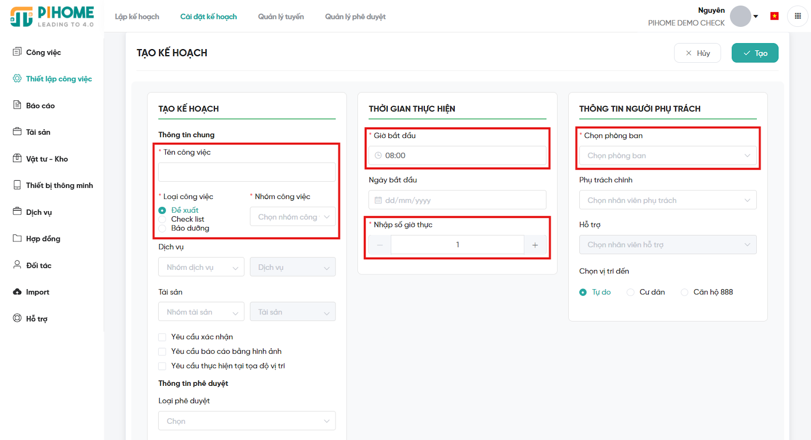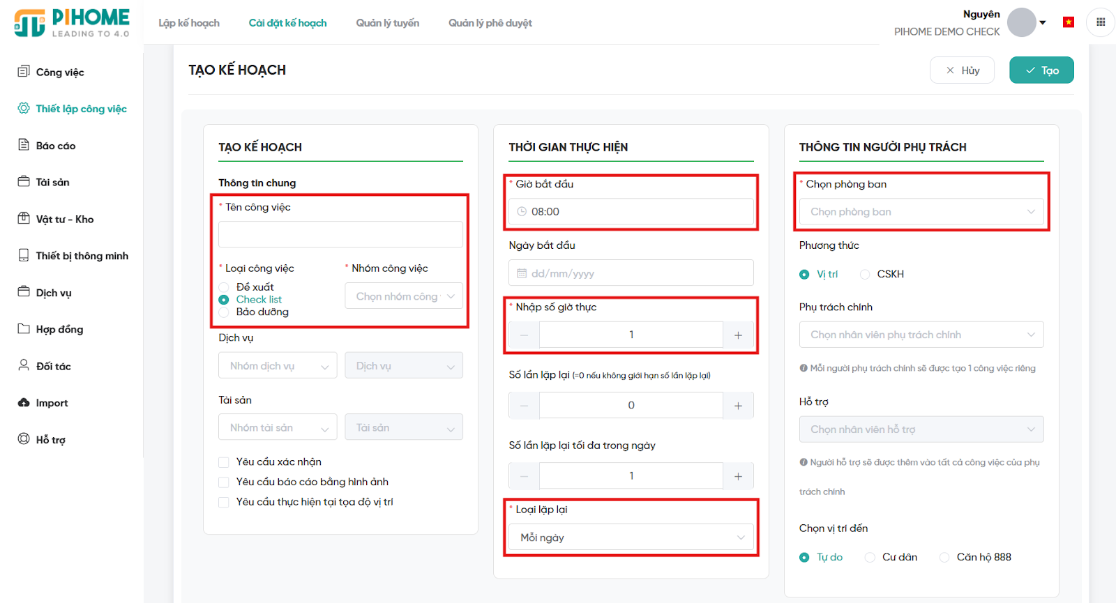Chức năng Cài đặt kế hoạch cho phép Ban Quản Lý thiết lập mẫu kế hoạch công việc chuẩn hóa, gồm các nội dung: