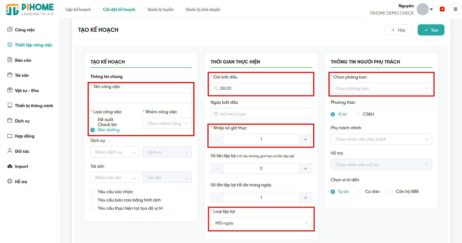 Sau khi được thiết lập, mẫu kế hoạch này sẽ được dùng trong chức năng Lập kế hoạch, giúp sinh công việc theo đúng chu kỳ (ngày, tuần, tháng) và phân công nhân sự chính xác theo từng loại công việc.