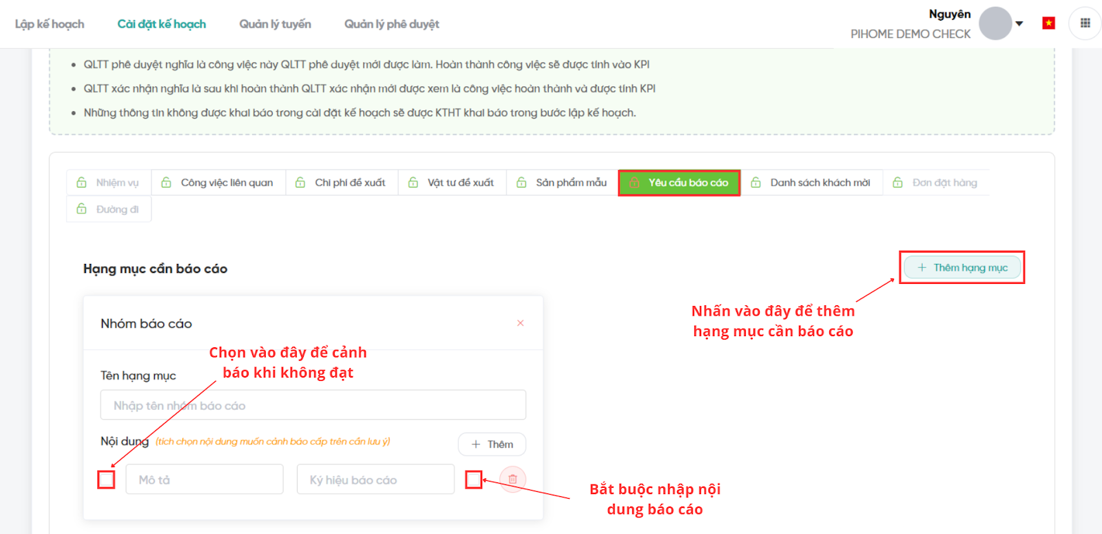 2) Quy trình Tạo kế hoạch (Thêm hạng mục báo cáo và Nhiệm vụ)