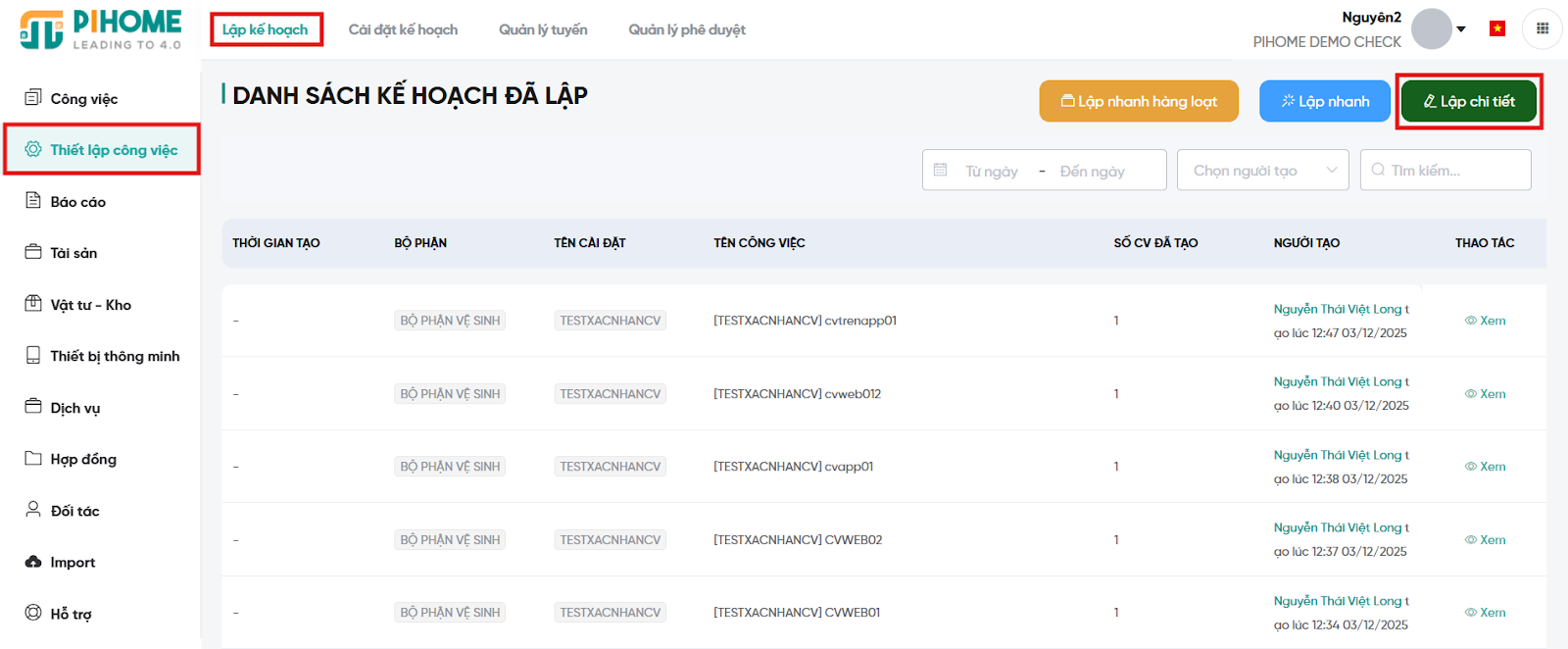 Bước 1: Tại phân hệ Vận hành BQL chọn “Thiết lập công việc” → “Lập kế hoạch” → Màn hình sẽ hiển thị danh sách các kế hoạch đã lập, BQL chọn “Lập chi tiết”.