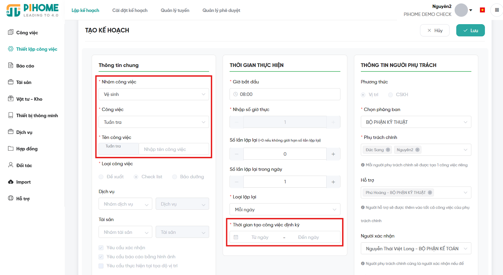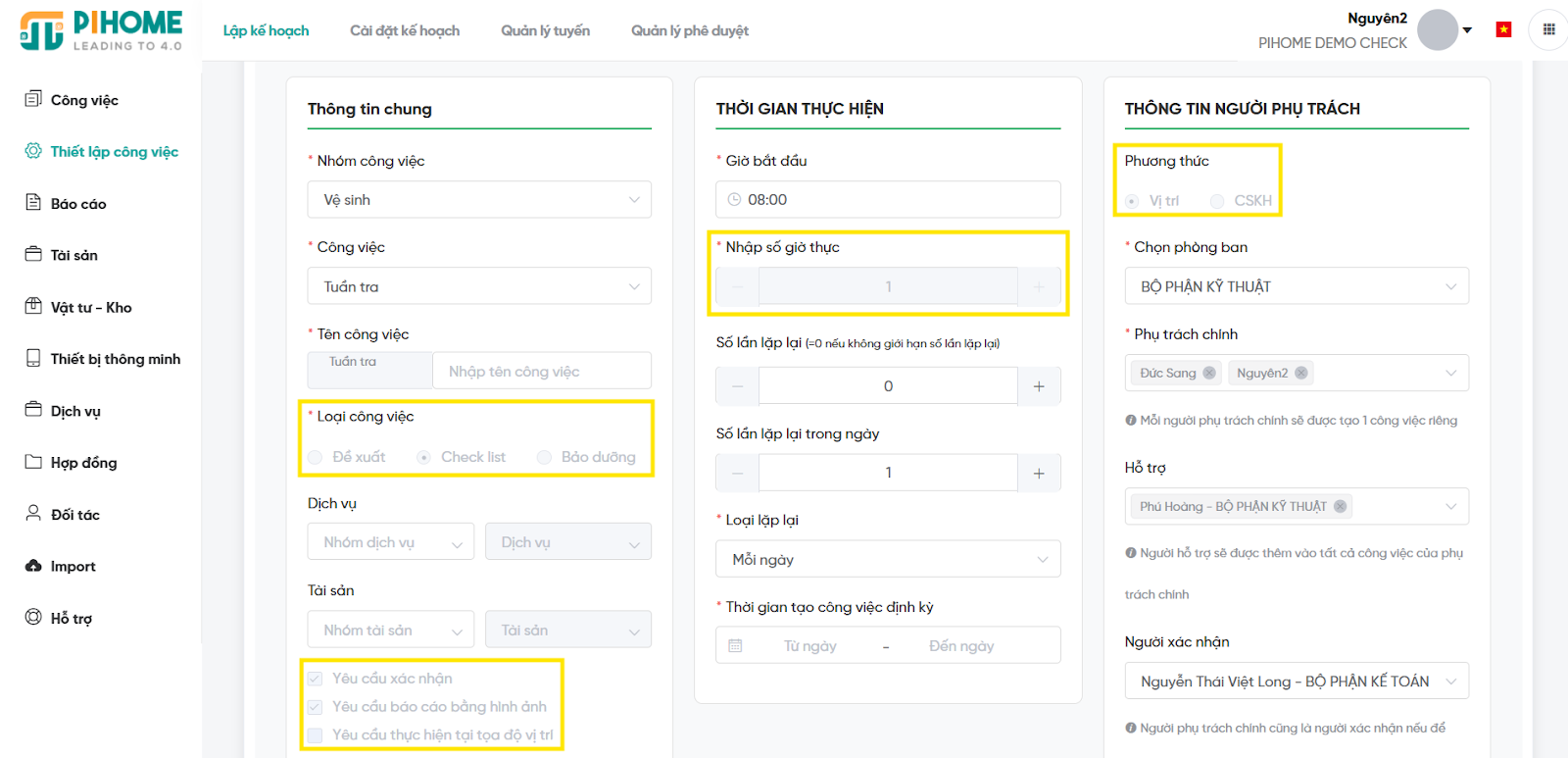 - Áp dụng cấu hình ban đầu: người phụ trách, thời lượng, quy trình phê duyệt, hạng mục báo cáo…