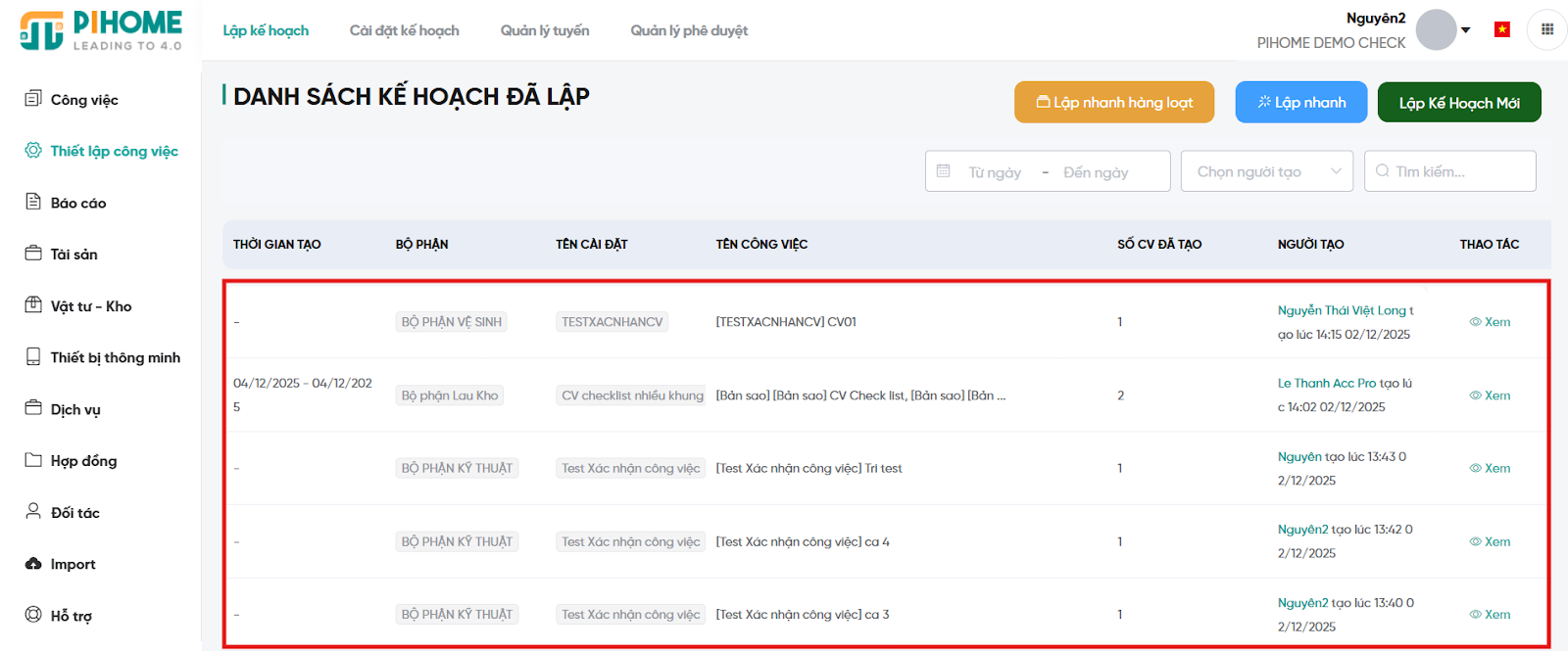 - Tạo ra công việc thực tế dựa trên mẫu đã cấu hình tại Cài đặt kế hoạch.