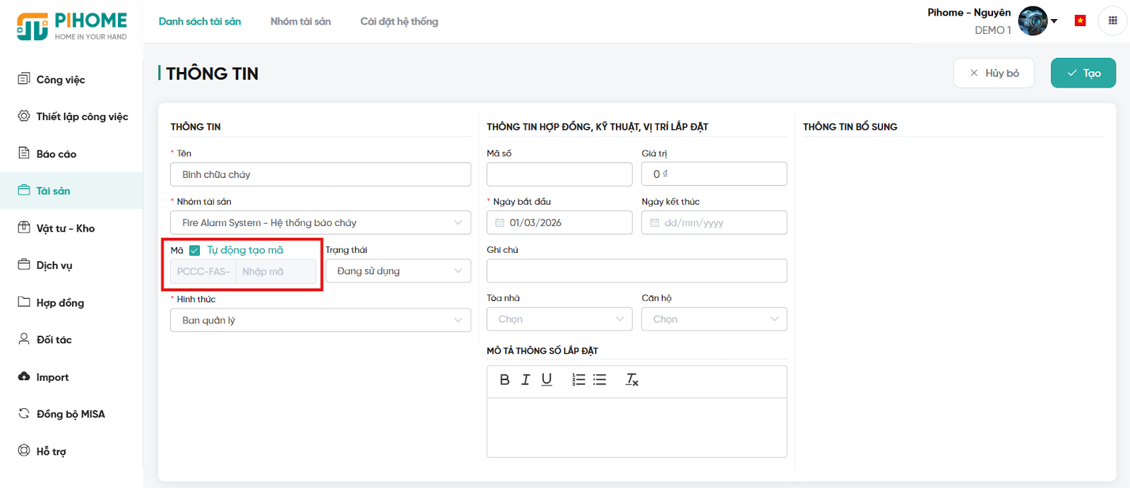 1. Chức năng tự động tạo mã khi tạo mới tài sản