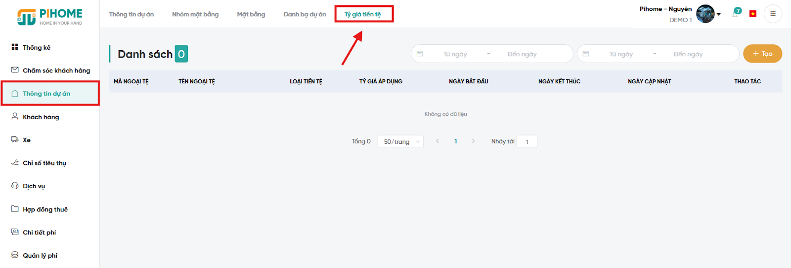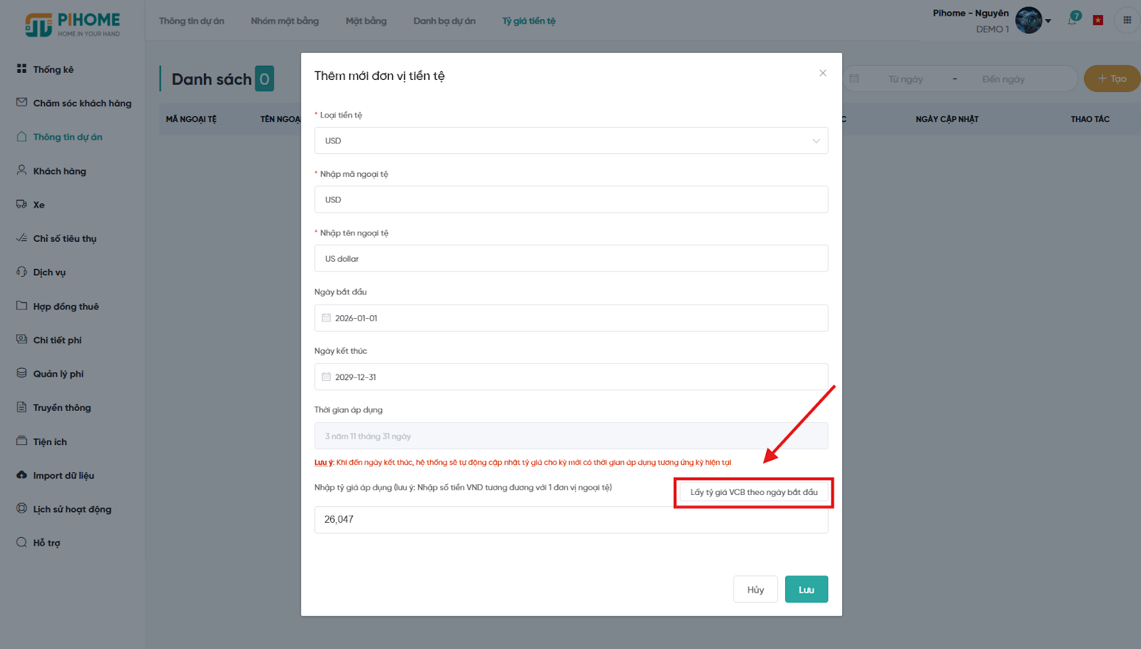 Bước 1: Thông tin dự án → Quản lý tỷ giá.