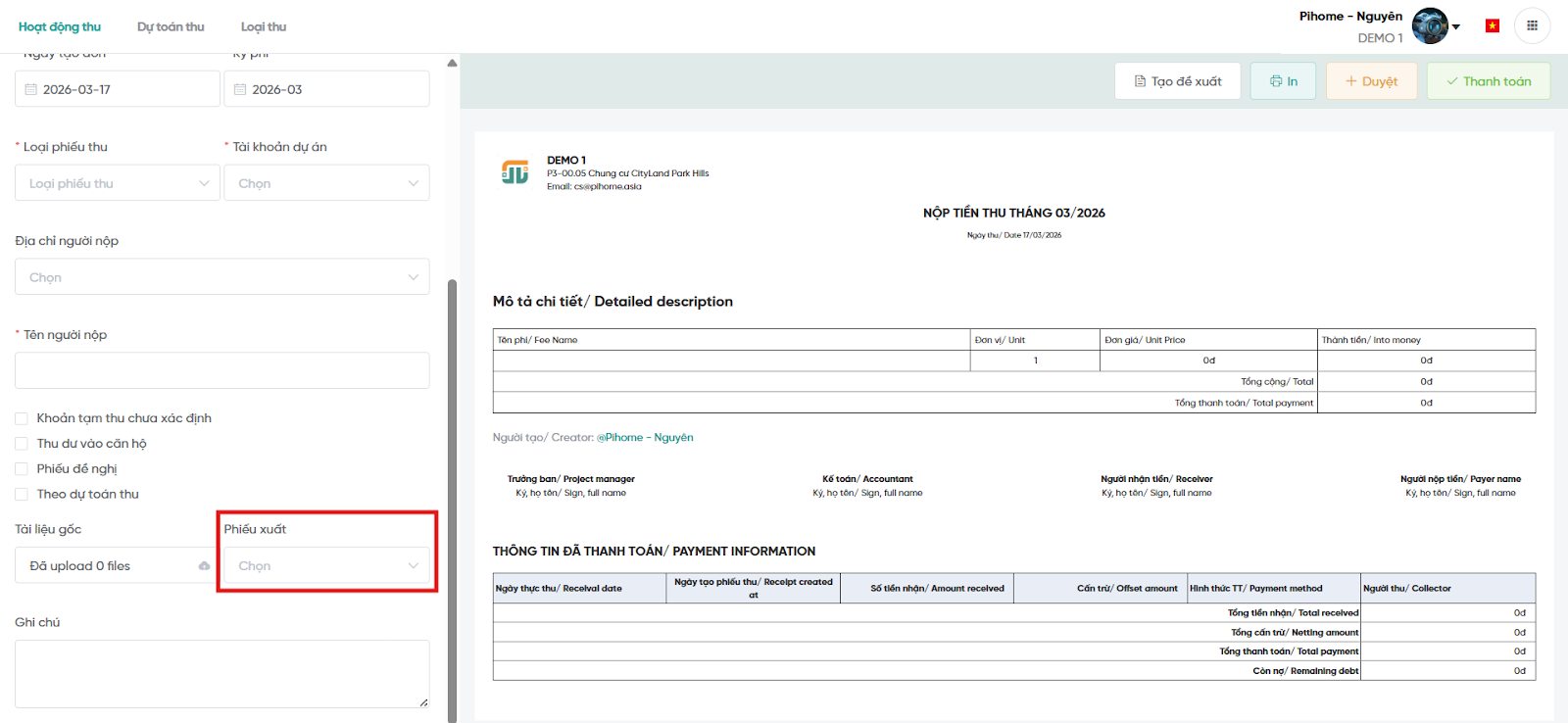 Màn hình tạo phiếu thu
