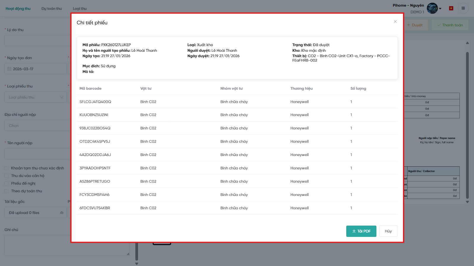 Bước 3: Có thể bấm vào để xem chi tiết hoặc in phiếu xuất/nhập kho.