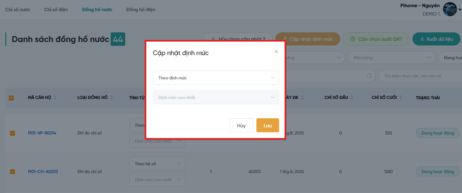 Bước 2: Vào màn hình đồng hồ điện/nước, chọn đồng hồ cần đổi cập nhật → Chọn “Cập nhật định mức” → bấm “Lưu”.
