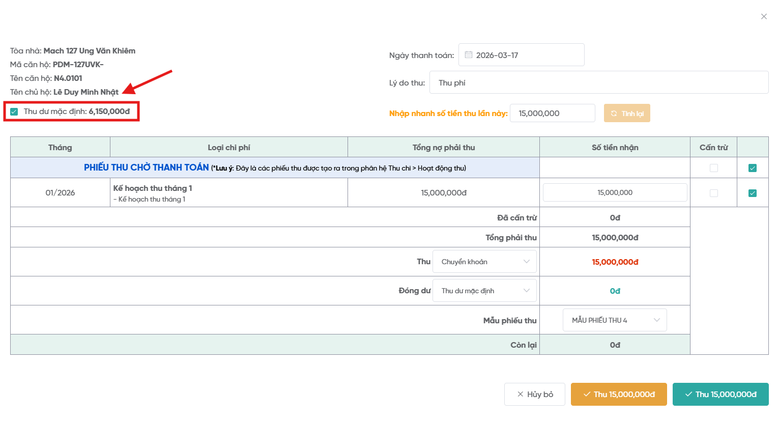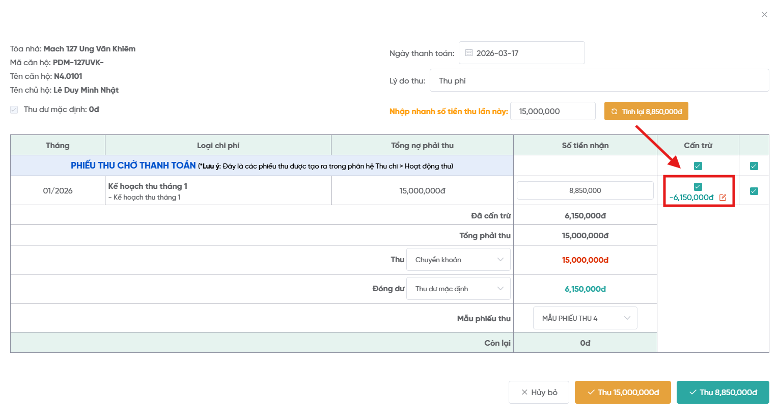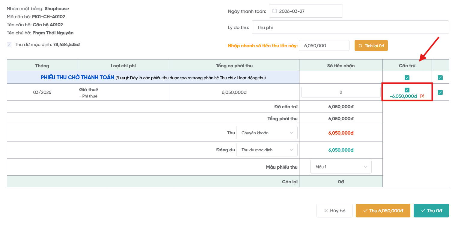 9. Chức năng thu dư và cấn trừ cho phiếu thu chờ thanh toán.