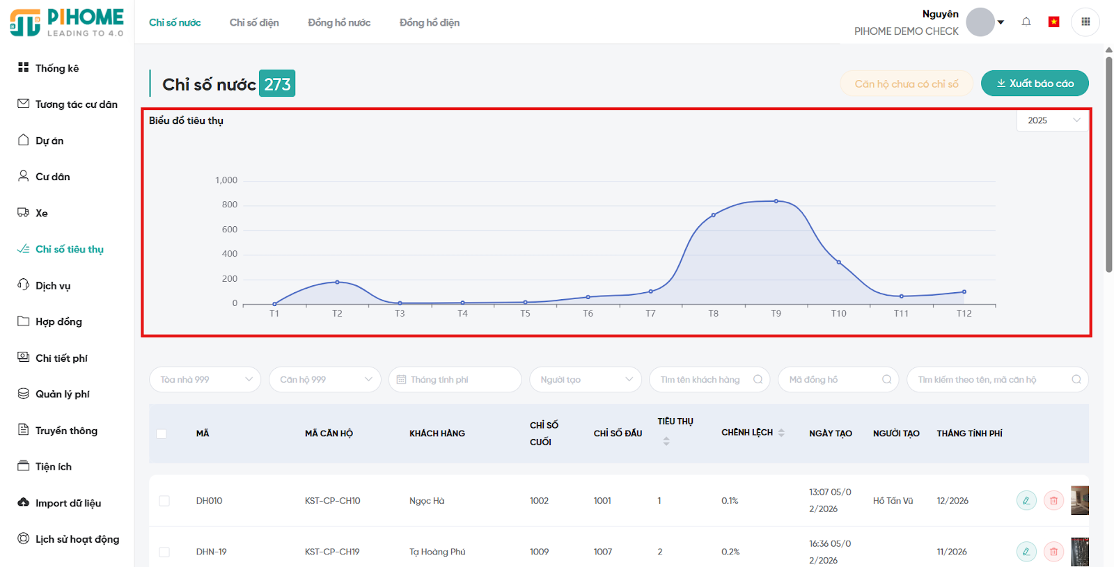 8. Biểu đồ và chức năng so sánh chênh lệch chỉ số điện và nước.