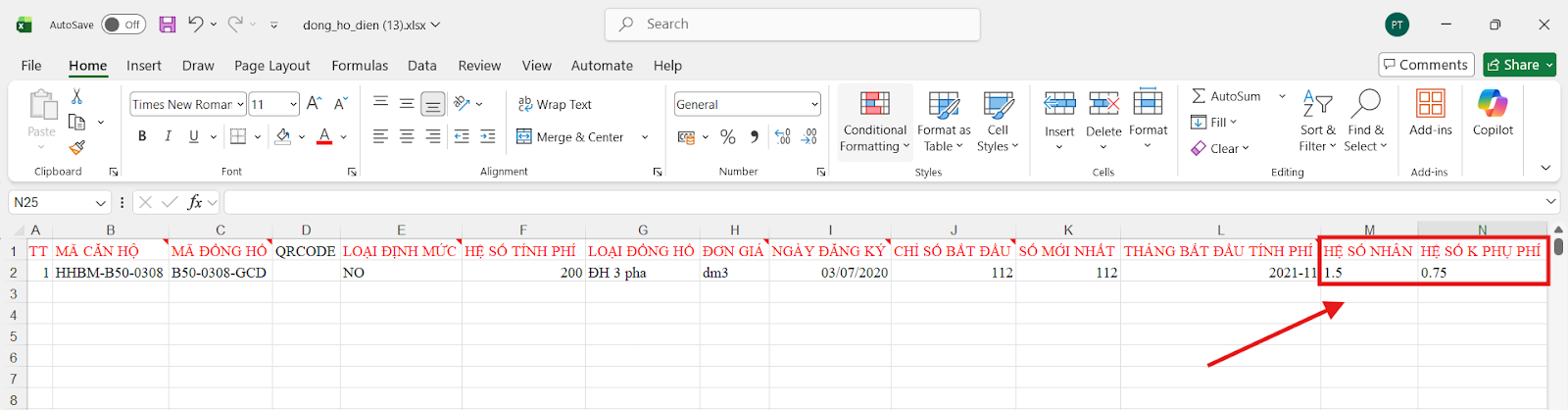 Bước 2: Nhập hệ số nhân, hệ số K phụ phí tương ứng của đồng hồ và import vào hệ thống.