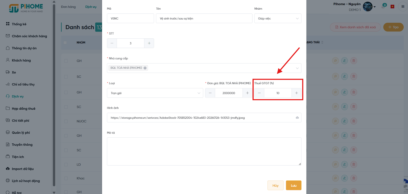 11. Chức năng đơn hàng dịch vụ tách được đơn giá và thuế VAT.