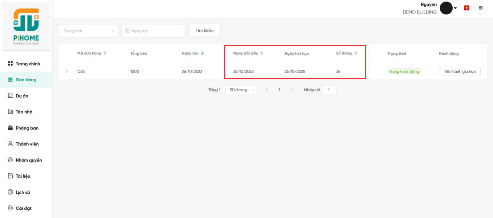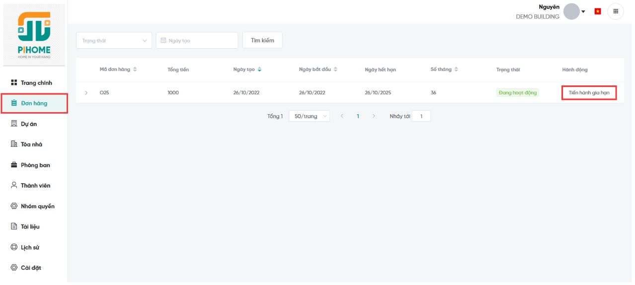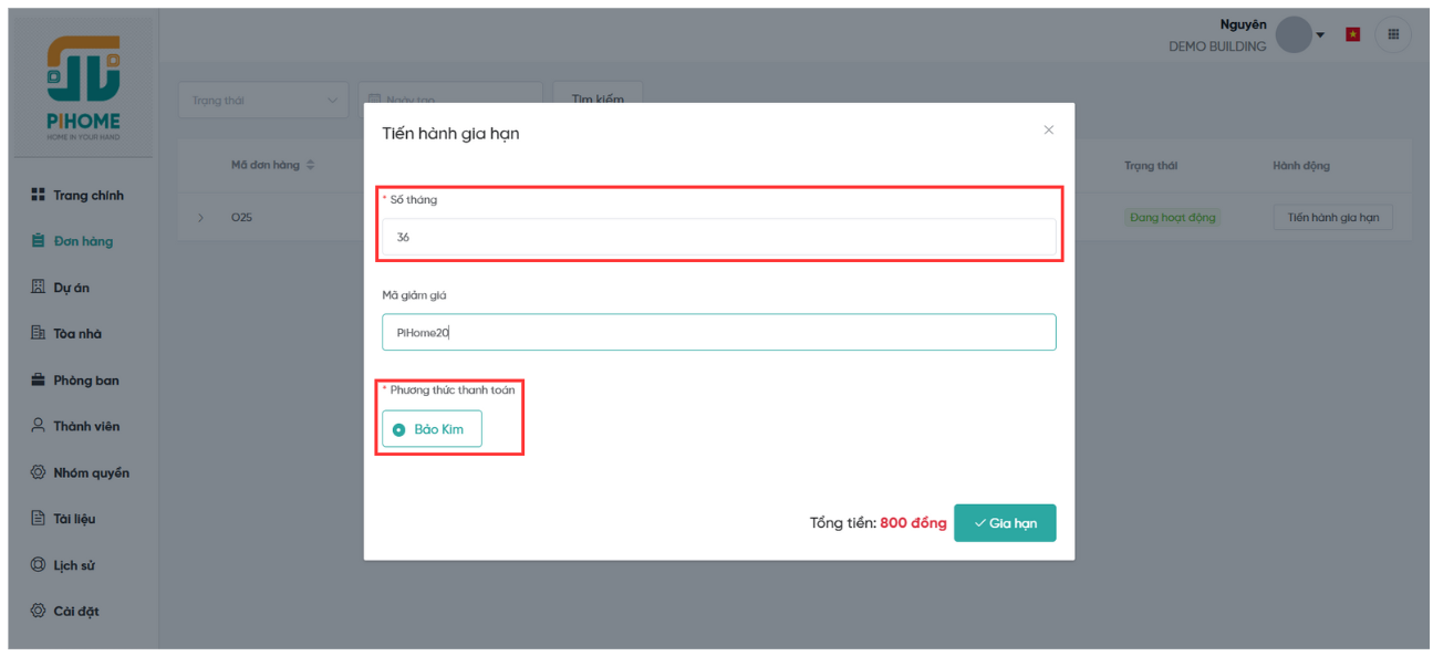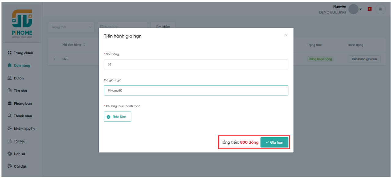 Mỗi đơn hàng đại diện cho một gói dịch vụ đang được áp dụng cho dự án. Khi đến hạn, khách hàng có thể gia hạn để tiếp tục sử dụng dịch vụ của PiHome. Việc gia hạn được hỗ trợ nhiều hình thức thanh toán và cho phép áp dụng mã giảm giá để tối ưu chi phí. Việc gia hạn dịch vụ quản lý dự án có thể thực hiện ngay trên phần mềm hoặc liên hệ trực tiếp với phía công ty để được hỗ trợ, hệ thống cũng sẽ cập nhật đầy đủ thông tin và thời hạn sử dụng của gói dịch vụ trên hệ thống.