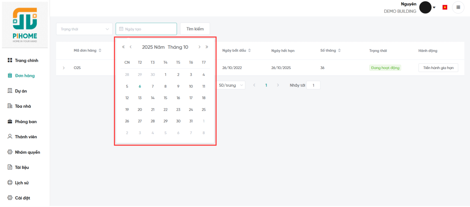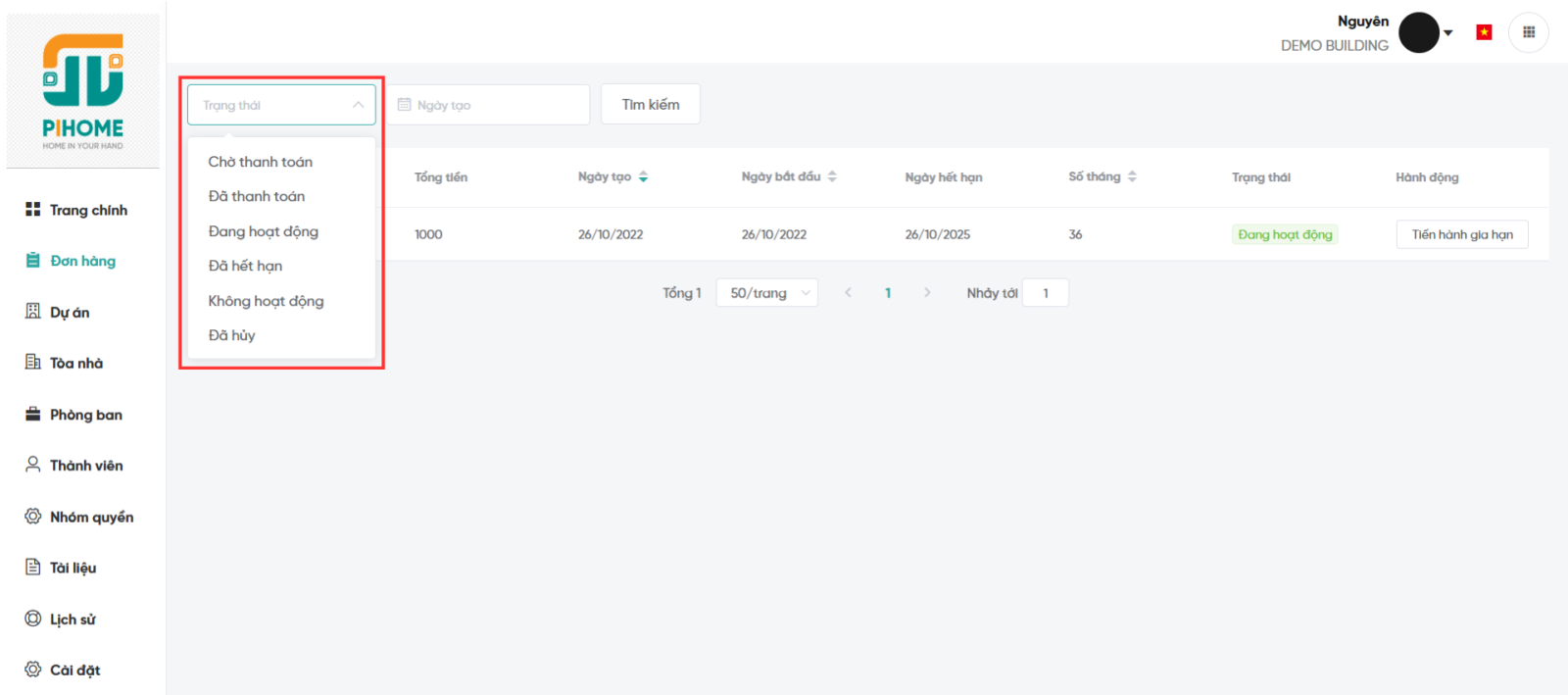 Chức năng Quản lý đơn hàng trong phân hệ Quản trị, là chức năng dành cho khách hàng, cụ thể hơn là Ban quản lý, Ban quản trị tòa nhà hoặc Chủ đầu tư dễ dàng theo dõi trạng thái các đơn hàng (tương ứng với các dự án đang sử dụng dịch vụ PiHome) và thực hiện gia hạn với công ty PiHome khi cần.