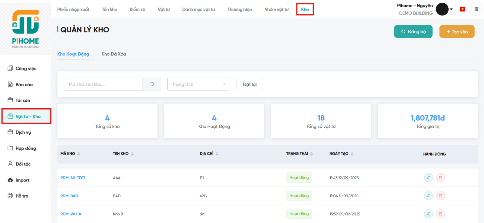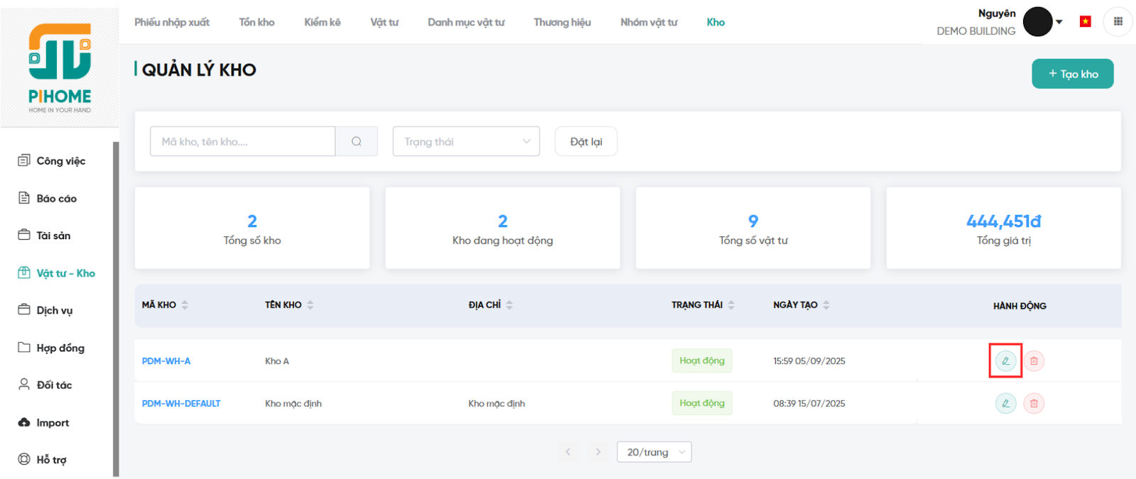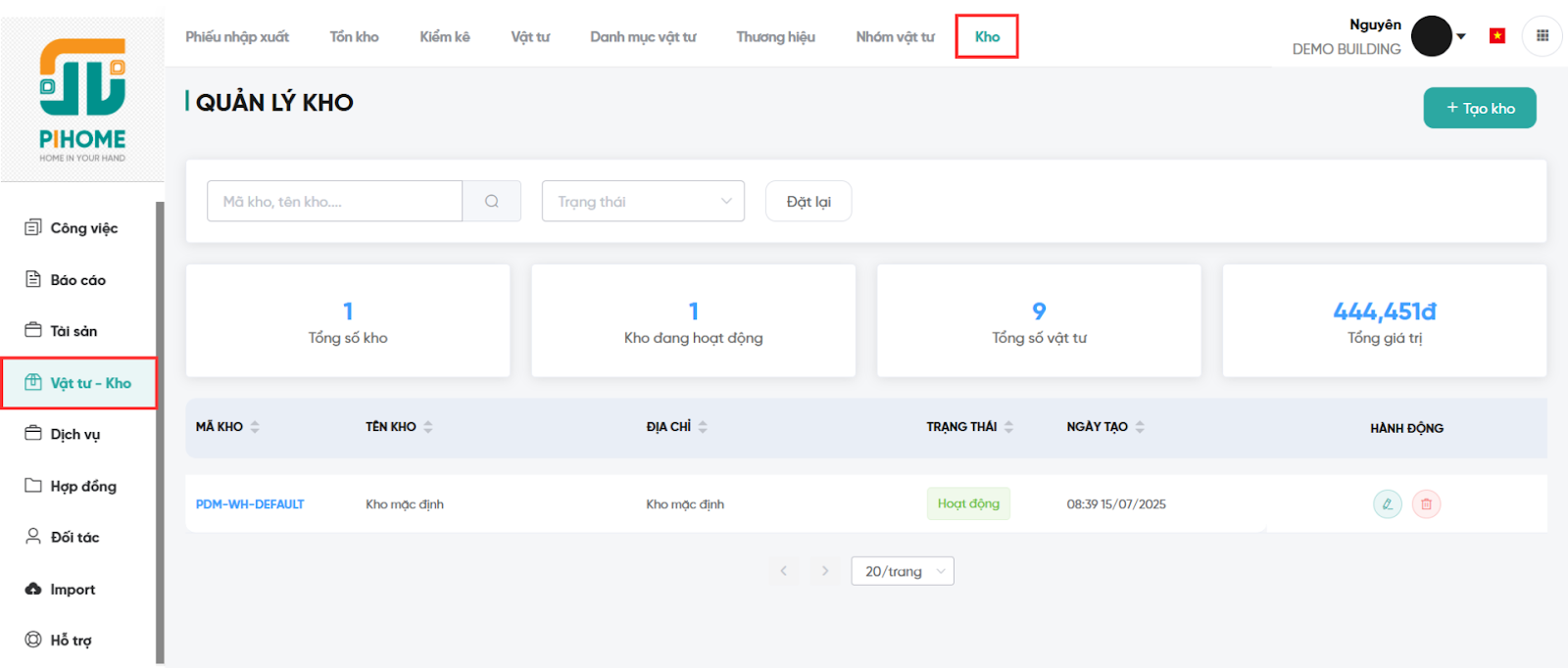 Bước 1: Tại menu “Vận hành” → vào “Vật tư – Kho” → chọn “Kho”. Màn hình hiển thị danh sách các kho hiện có.