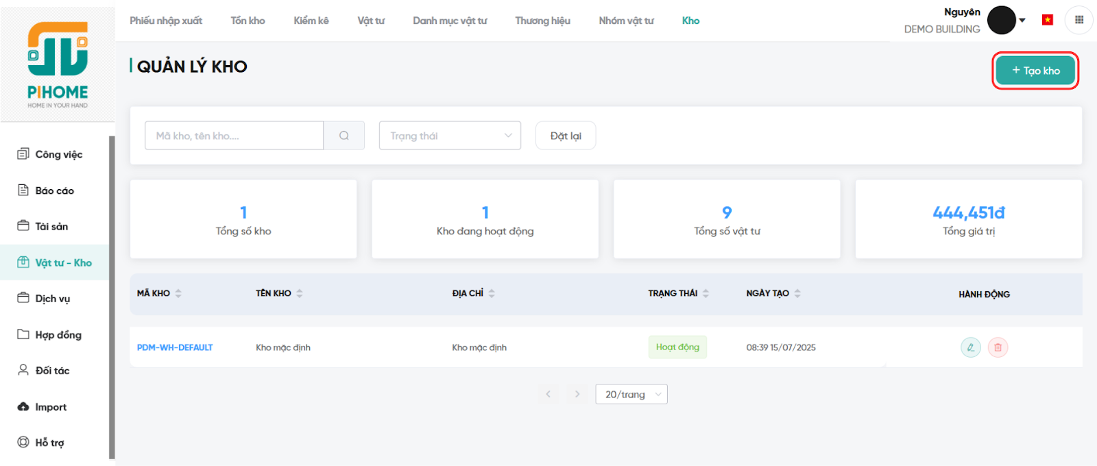 Bước 2: Nhấn vào nút “Tạo kho” ở góc trên bên phải.