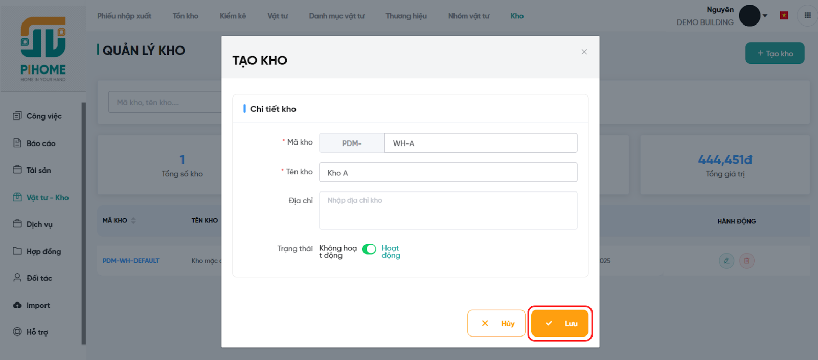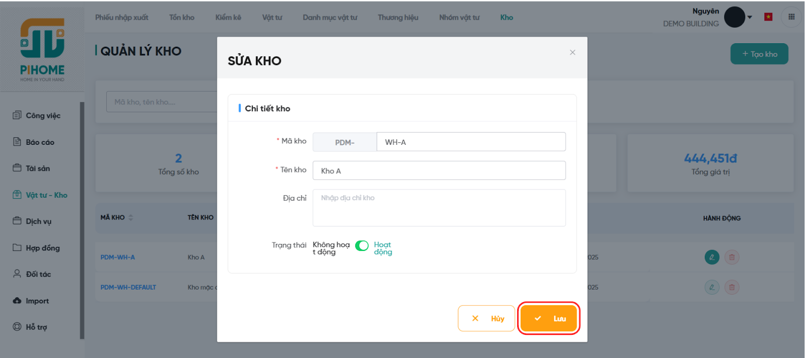 Cho phép thiết lập tình trạng hoạt động của kho: “Hoạt động” hoặc “Không hoạt động”. Ở trạng thái mặc định, hệ thống sẽ kích hoạt trạng thái “Hoạt động”. |