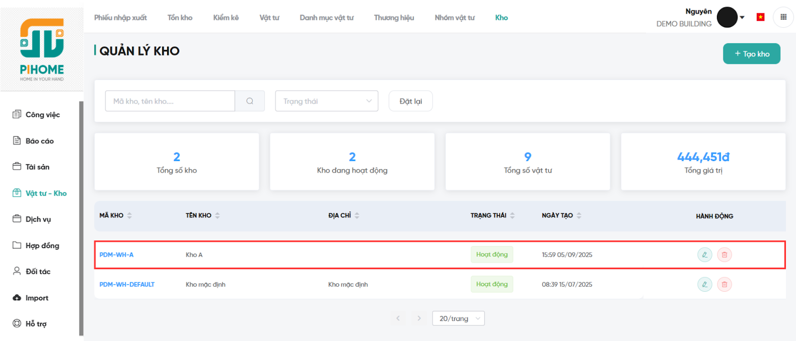 Kho mới được tạo thành công và hiện tại danh sách quản lý kho.