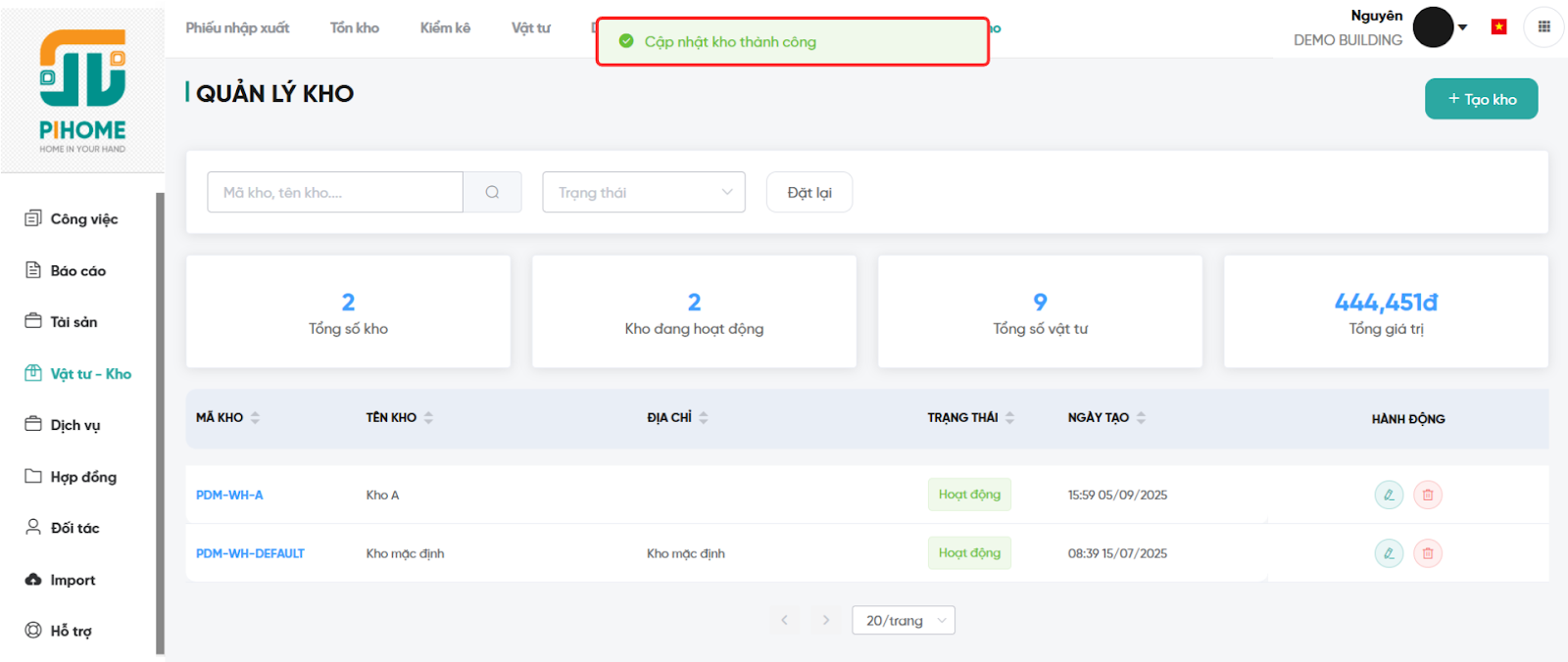 Hệ thống hiển thị thông báo kho được cập nhật thành công.