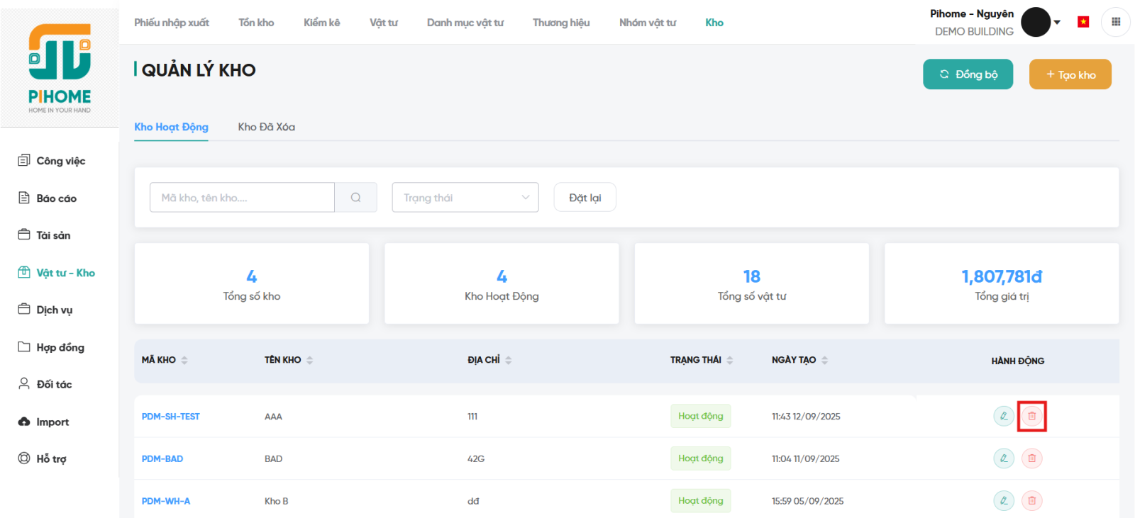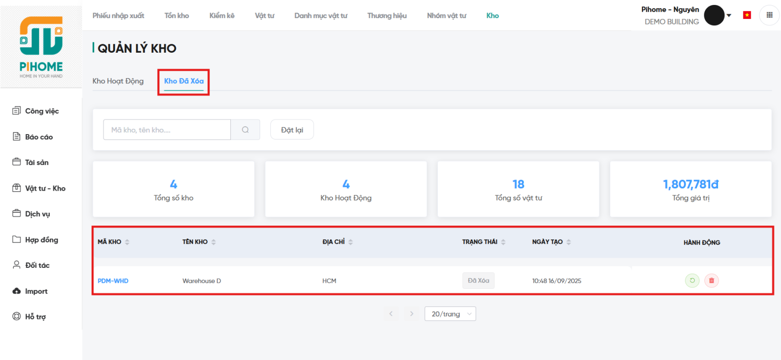 Kho được xóa sẽ chuyển đến danh sách “Kho Đã Xóa”.
