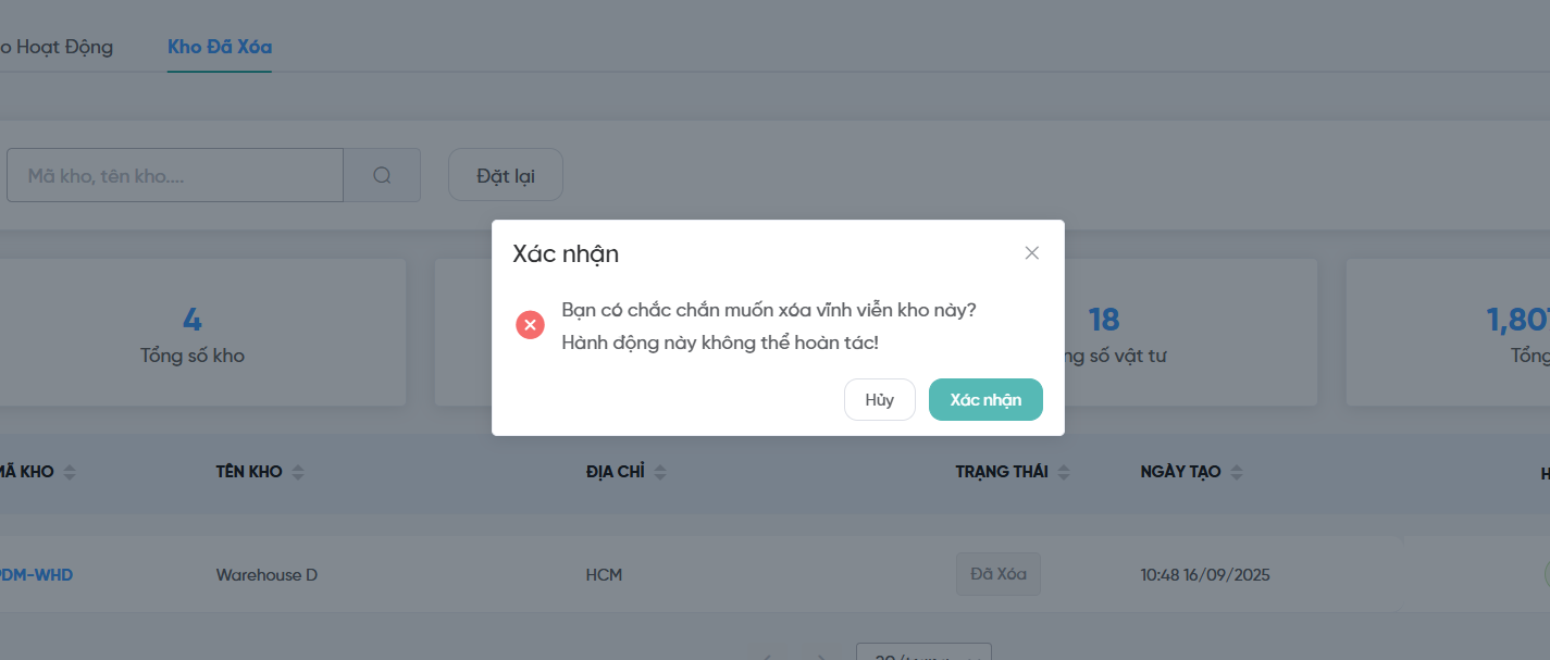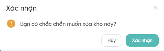 . Hệ thống hiển thị thông báo xác nhận thao tác của người dùng, chọn “Xác nhận” để xóa vĩnh viễn kho và không thể hoàn tác.