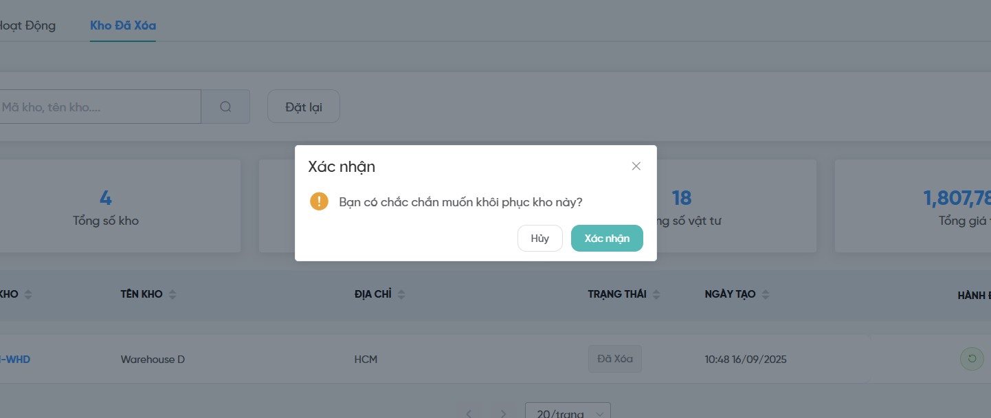 . Hệ thống hiển thị thông báo xác nhận thao tác của người dùng, chọn “Xác nhận” để khôi phục kho. Kho được khôi phục sẽ hiển thị tại danh sách “Kho hoạt động”