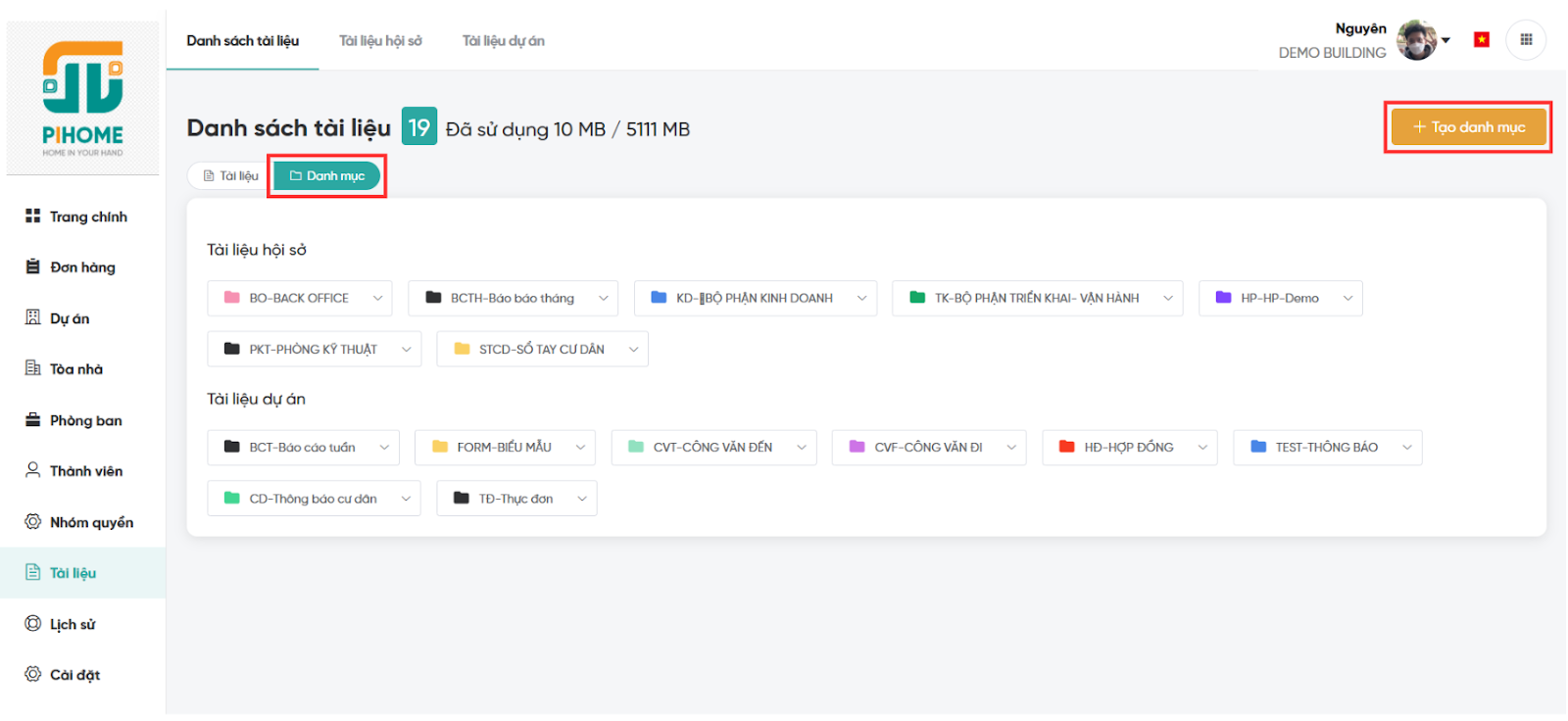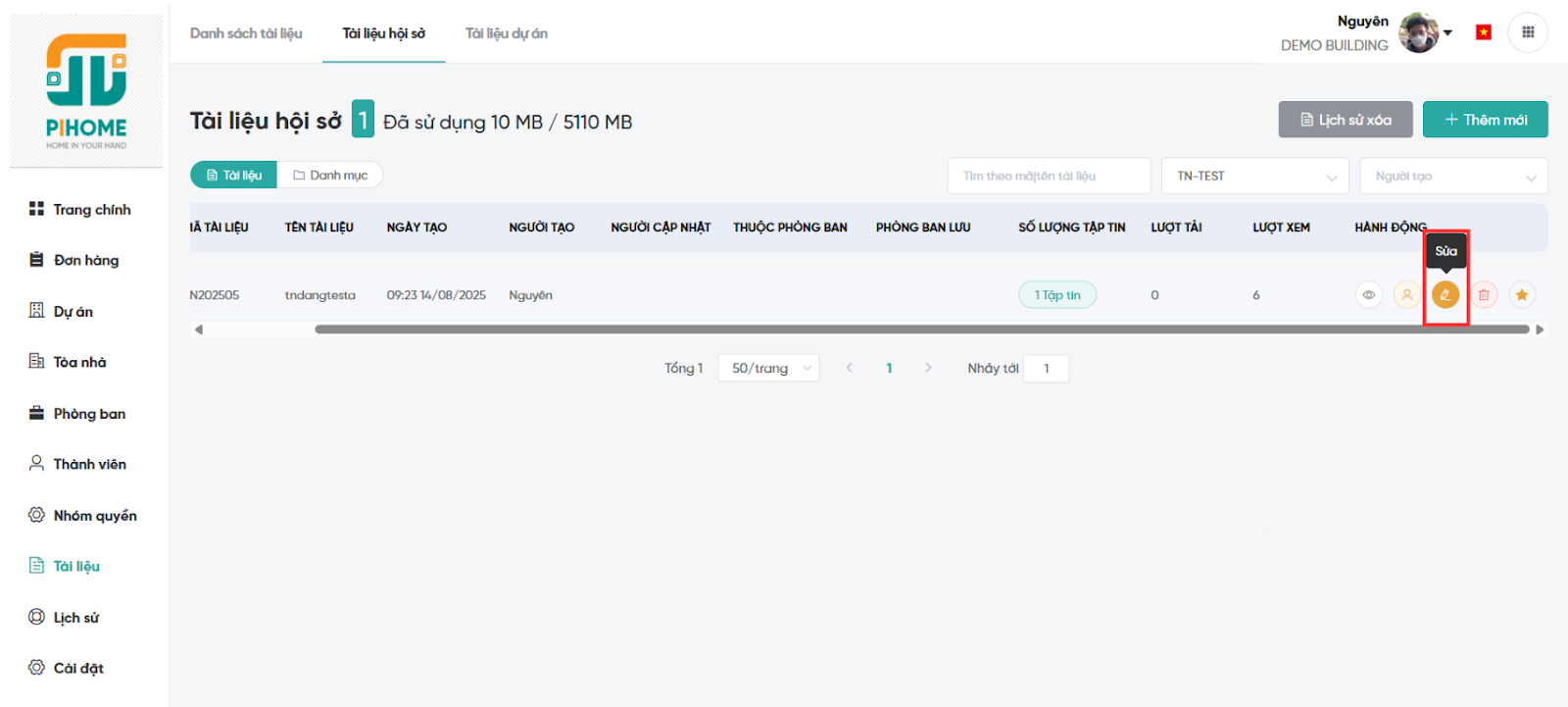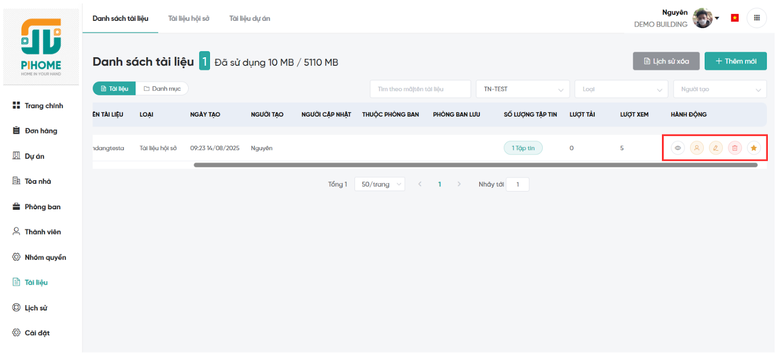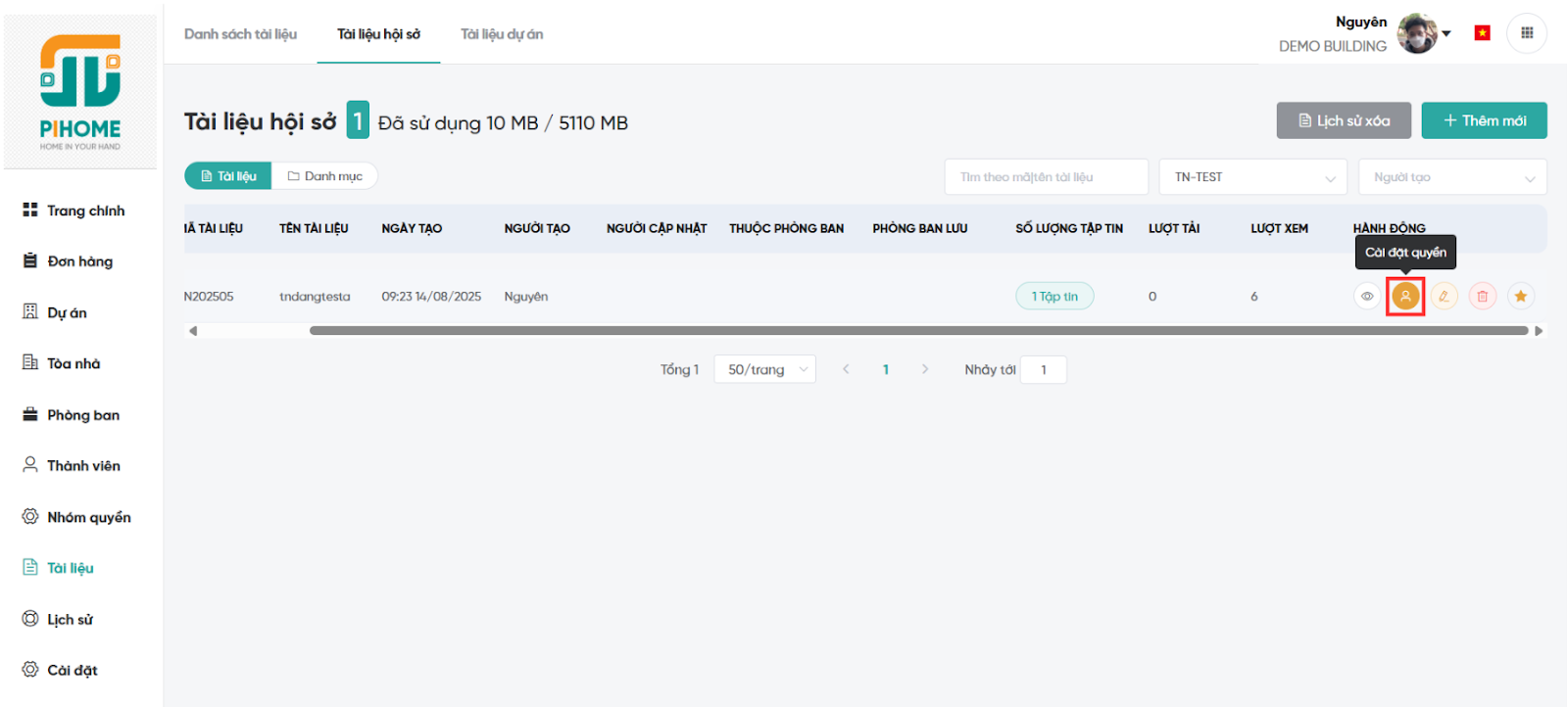 Bước 4: Nhấn "Tạo" để lưu. Tài liệu mới sẽ xuất hiện trong danh sách, với các chức năng: xem chi tiết, cài đặt quyền, sửa, xóa, và đánh dấu yêu thích.