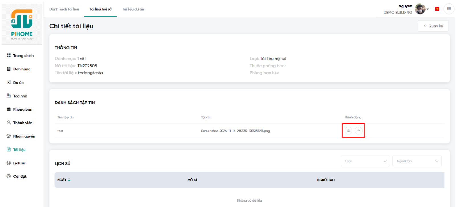 Bước 3: Có thể xem trực tiếp trên hệ thống (Ký hiệu “Con mắt”) hoặc tải về máy để sử dụng trong công việc kinh doanh. Lịch sử ghi nhận mọi thay đổi, giúp theo dõi và kiểm toán dễ dàng.