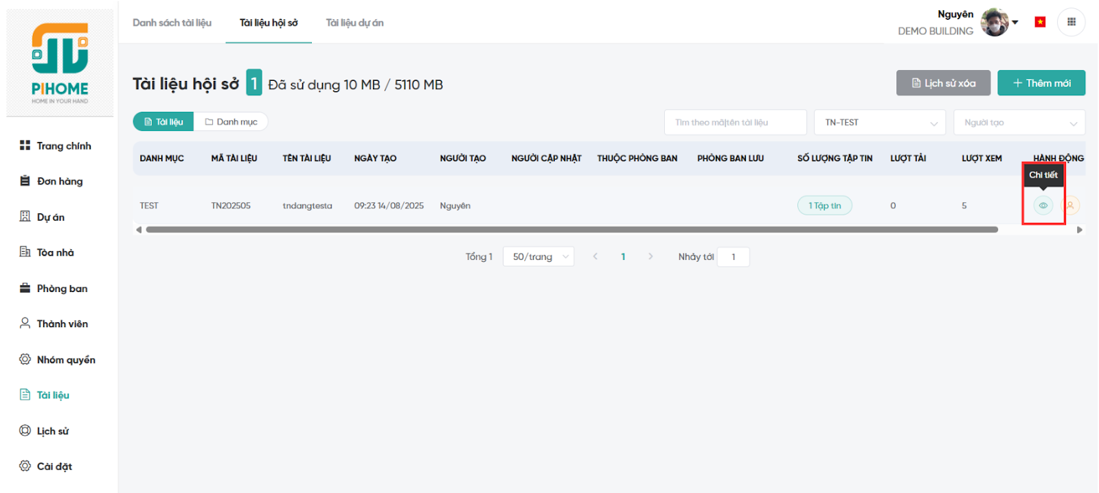 Bước 2: Nhấn "Xem chi tiết" để hiển thị thông tin tài liệu, danh sách tập tin và lịch sử thay đổi.