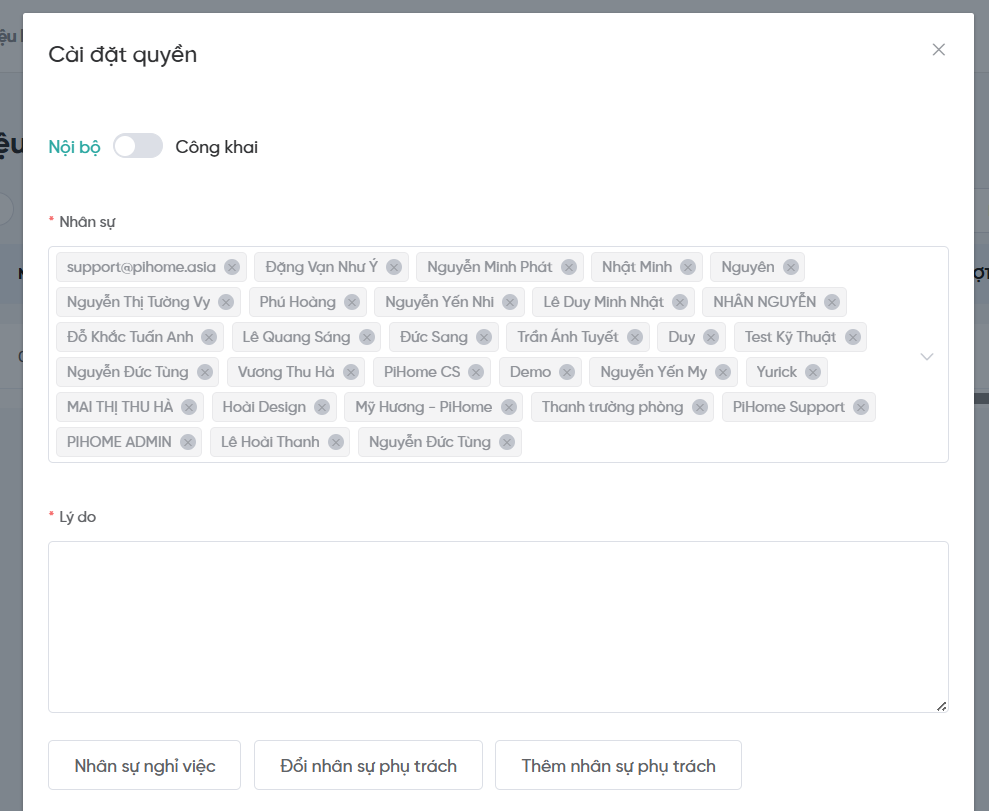 Quy trình cho Tài liệu dự án tương tự Tài liệu hội sở. Mọi hành động xóa hoặc thay đổi quyền đều yêu cầu lý do để đảm bảo trách nhiệm và kiểm soát rủi ro.