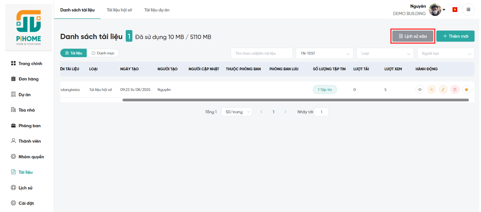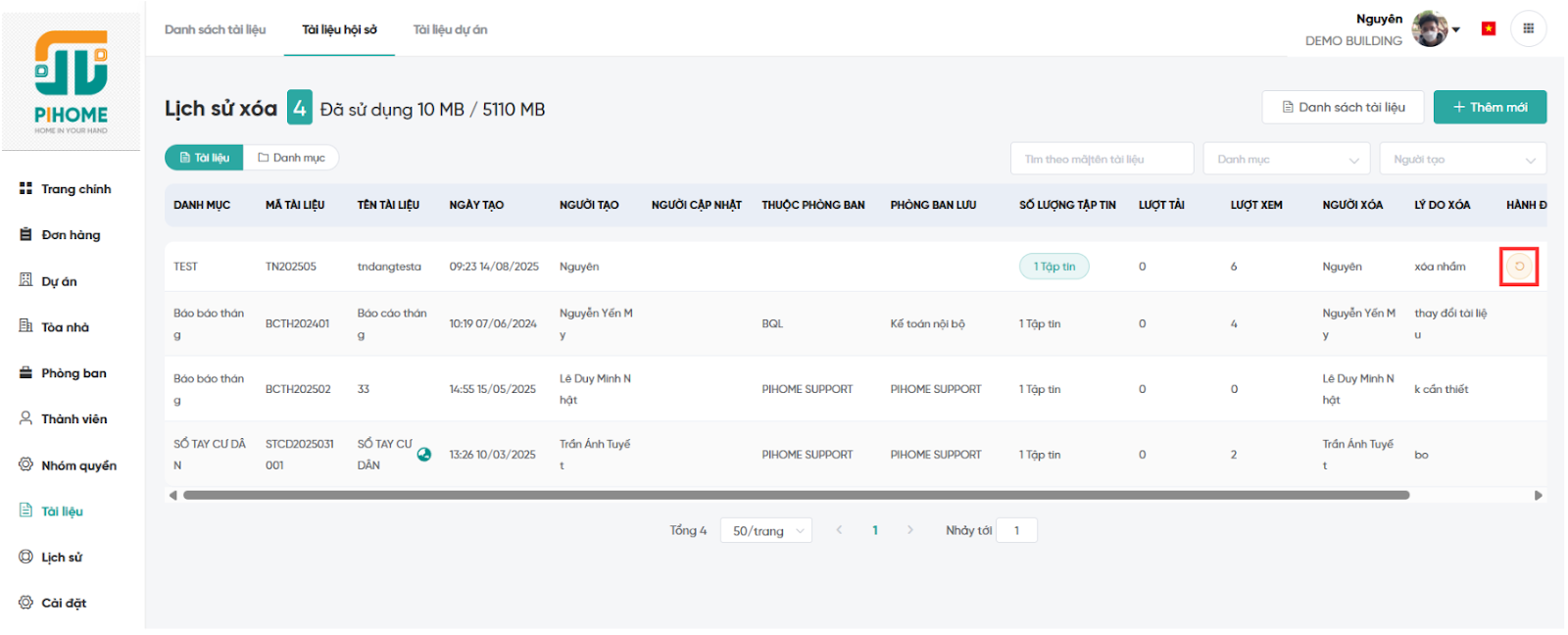 Lưu ý: Tài liệu đã xóa nằm trong Lịch sử xóa và có thể Phục hồi.