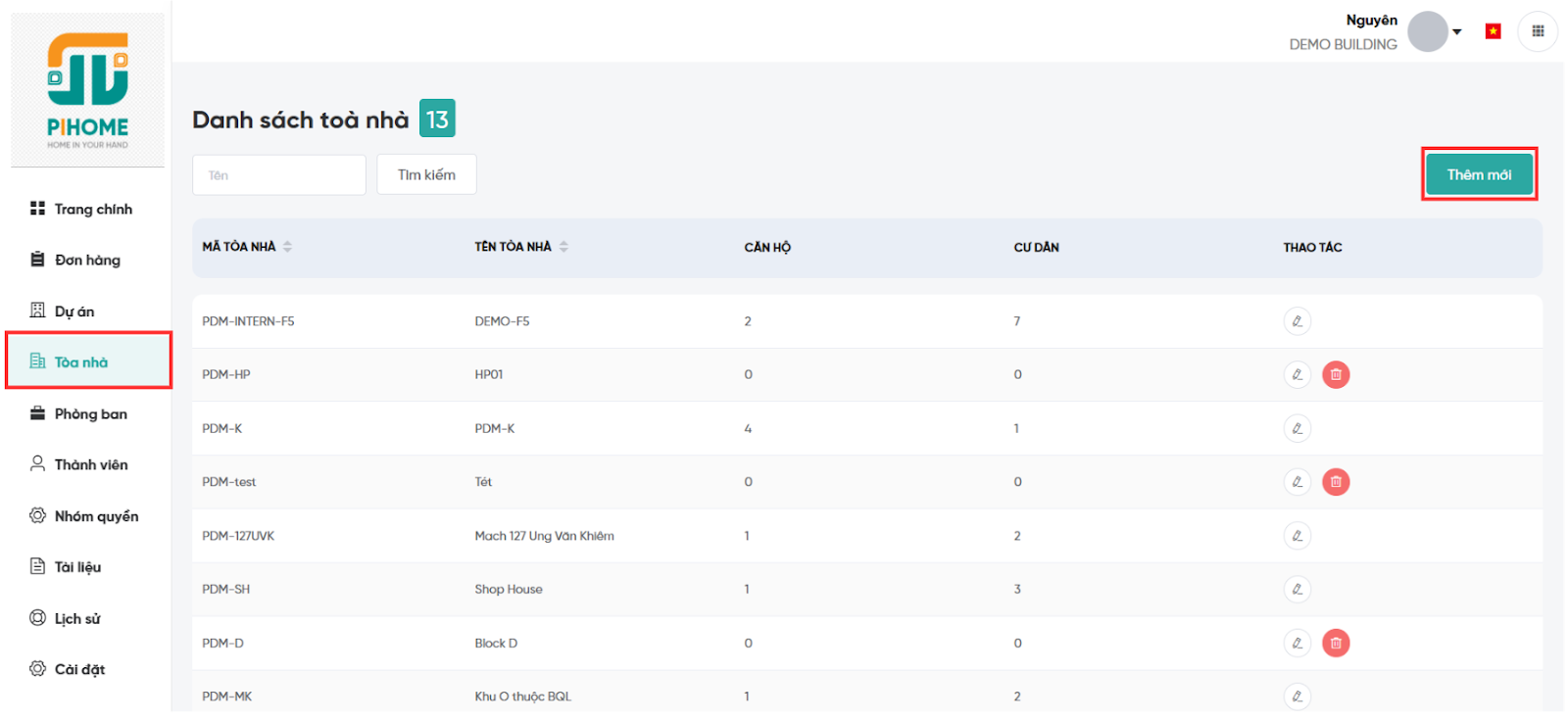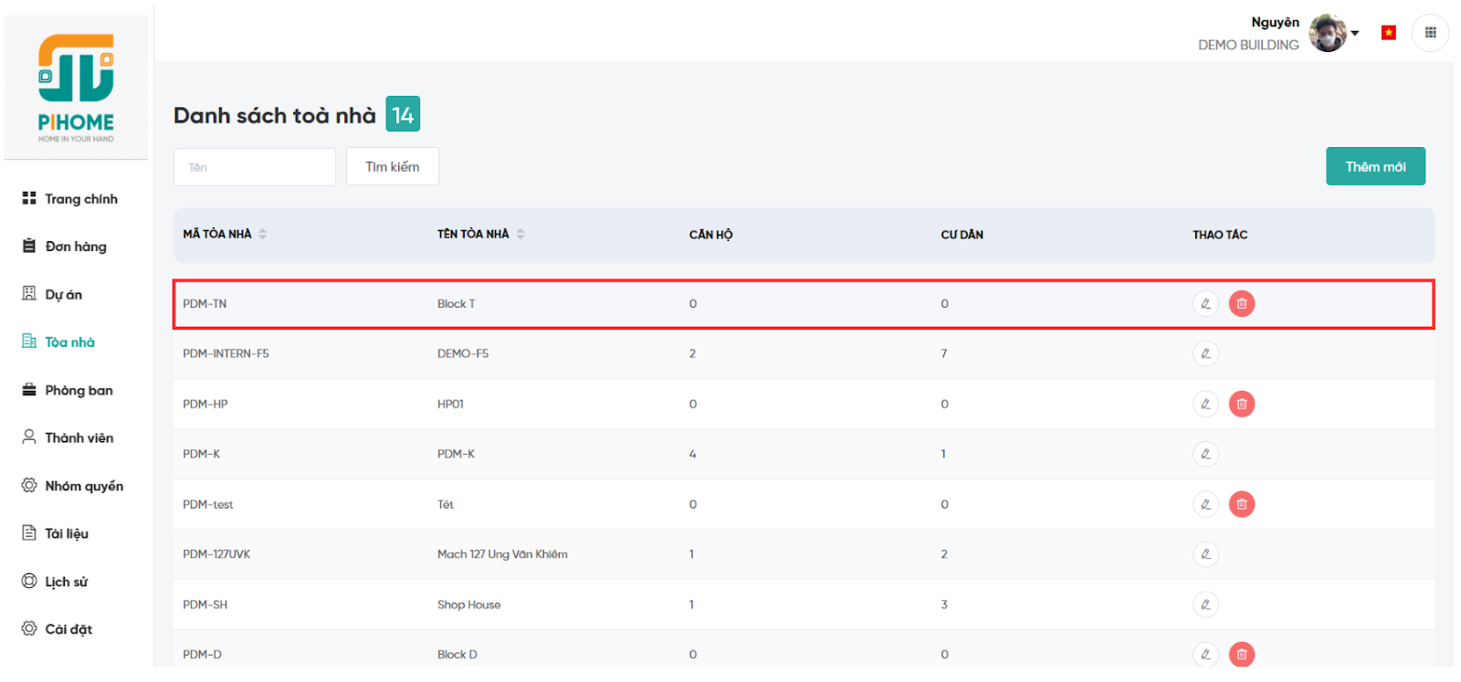 - Sử dụng ô “Tìm kiếm” để lọc nhanh theo tên hoặc mã tòa nhà.