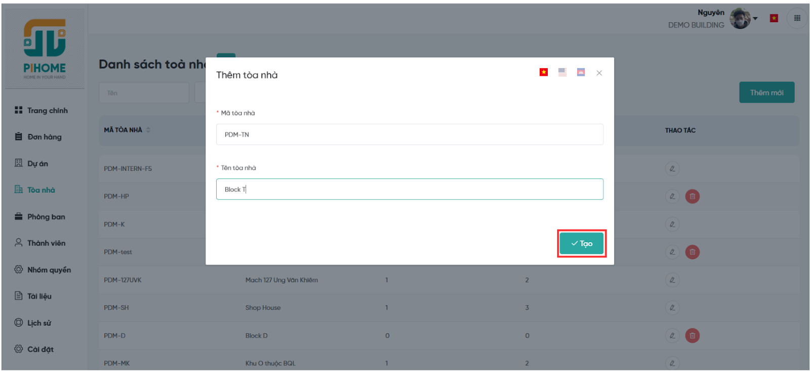 Bước 3: Chọn “Tạo” để lưu tòa nhà mới.