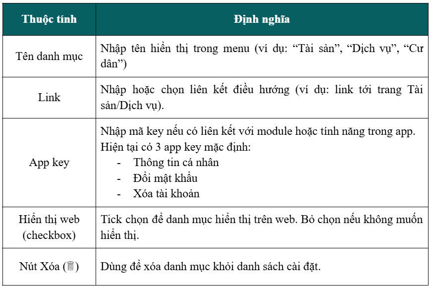 Chức năng Thiết lập menu cho App vận hành cho phép quản trị viên cấu hình các danh mục hiển thị trong sidebar menu của ứng dụng vận hành.