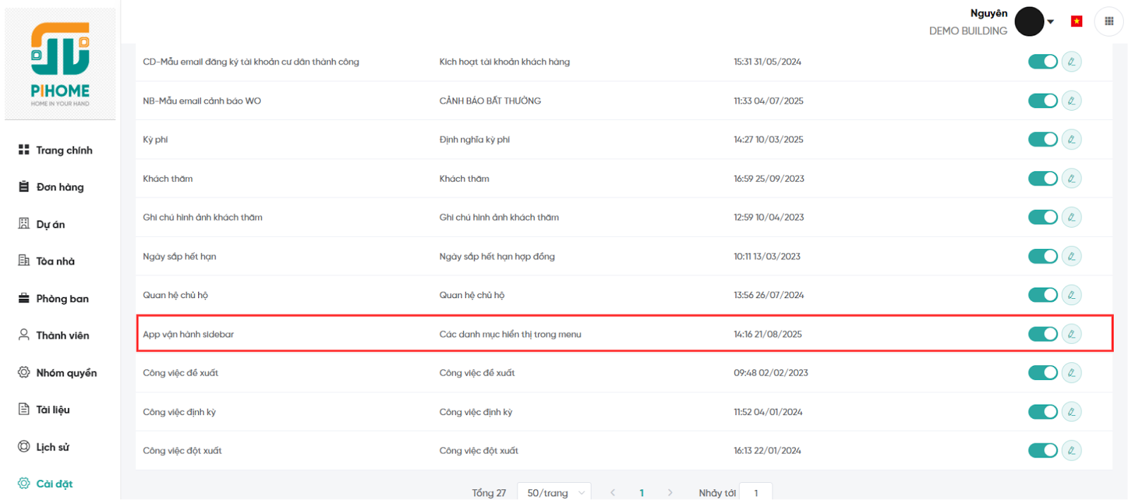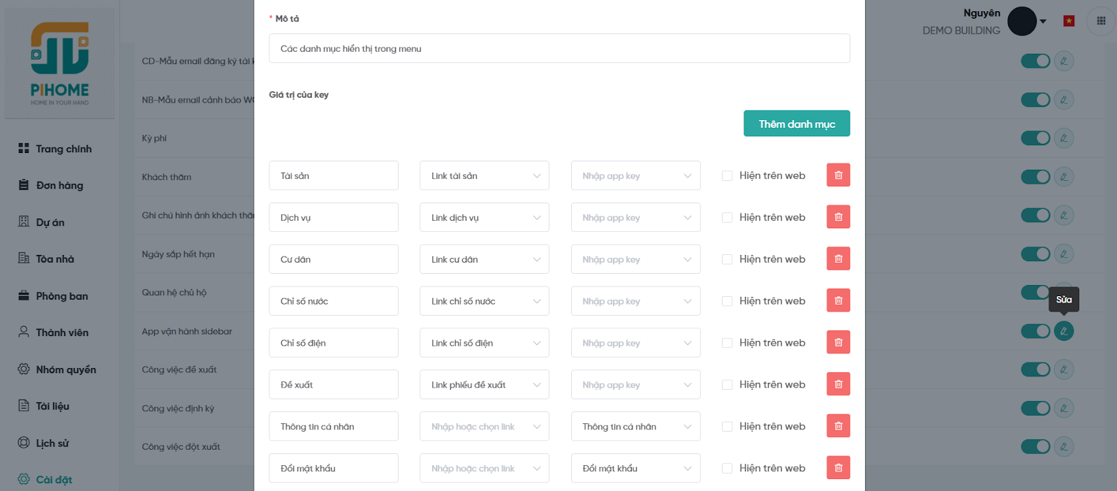 Khi lưu thành công, thông tin danh mục sẽ hiển thị trong danh sách cài đặt và danh mục vừa tạo sẽ hiển thị trong danh sách menu sidebar của app Vận hành (PiWorks).
