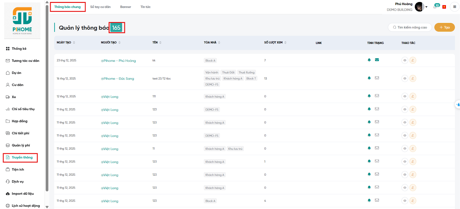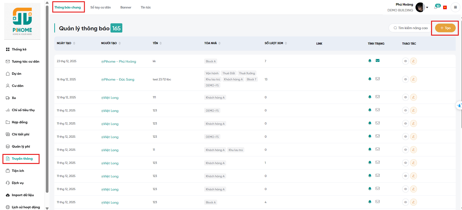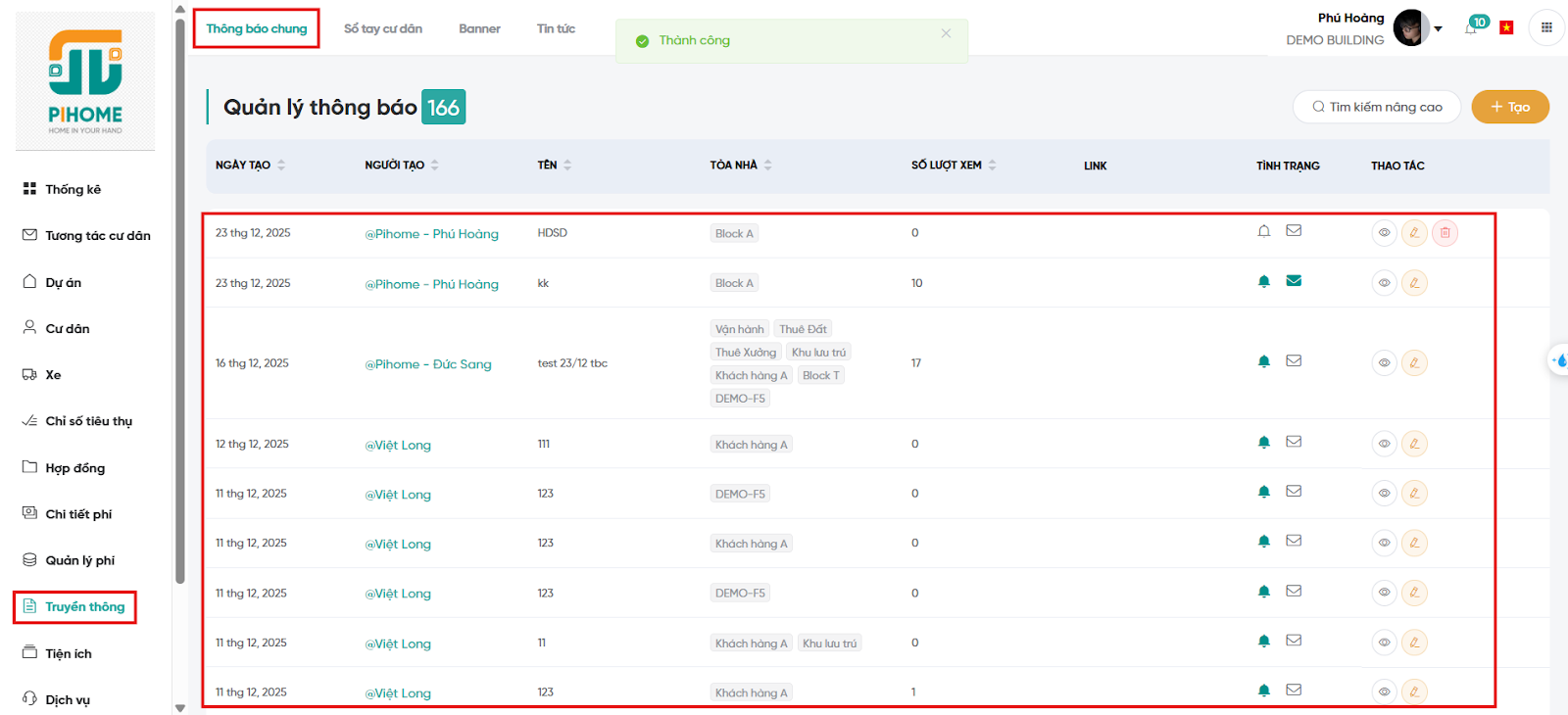 Nhằm giúp cư dân có thể nắm bắt và cập nhật thông tin về chung cư một cách liên tục. Người dùng có thể tạo các thông báo khác nhau trên hệ thống và gửi tin tức này đến cư dân theo tòa nhà hoặc tất cả cư dân sống trong chung cư.