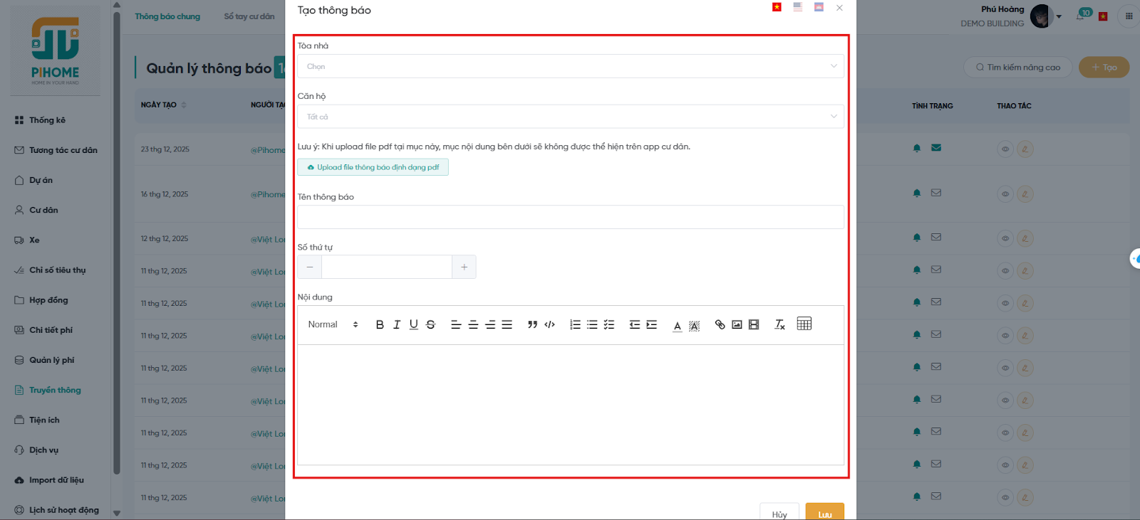 Bước 3: Nhấn “Lưu” để xác nhận lưu bài thông báo đồng thời gửi đến các tòa nhà được đính kèm khi tạo bài thông báo hoặc nhấn “Hủy” để xác nhận hủy bỏ thao tác tạo mới bài thông báo.