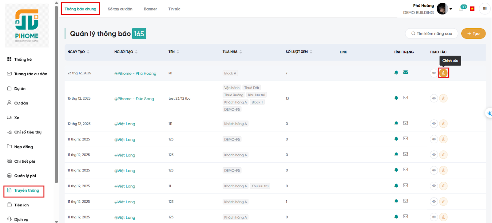 Bước 1: Tại menu “Quản lý” → chọn “Truyền thông” → chọn “Thông báo chung” → chọn “Chỉnh sửa” dưới cột thao tác.