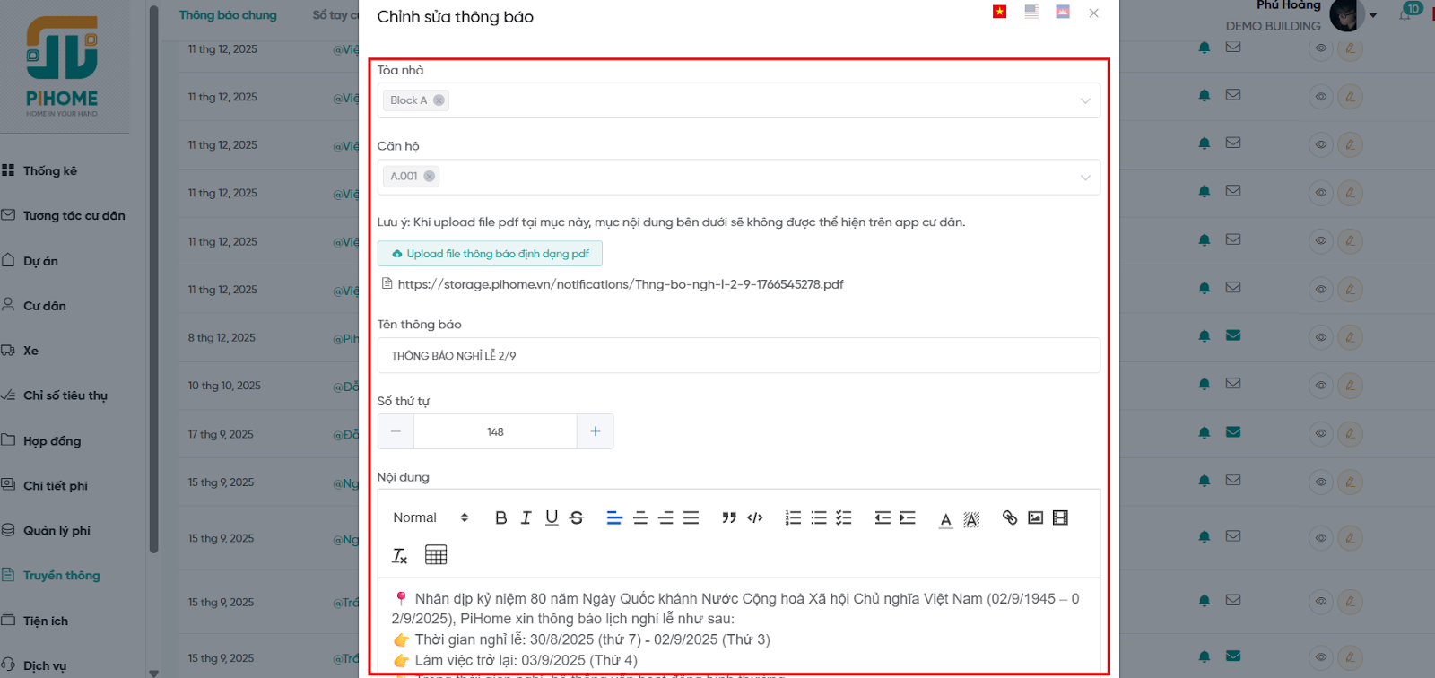Lưu ý: Khi đã gửi thông báo cho cư dân, thông báo đó sẽ không thể thao tác sửa/xóa nữa.