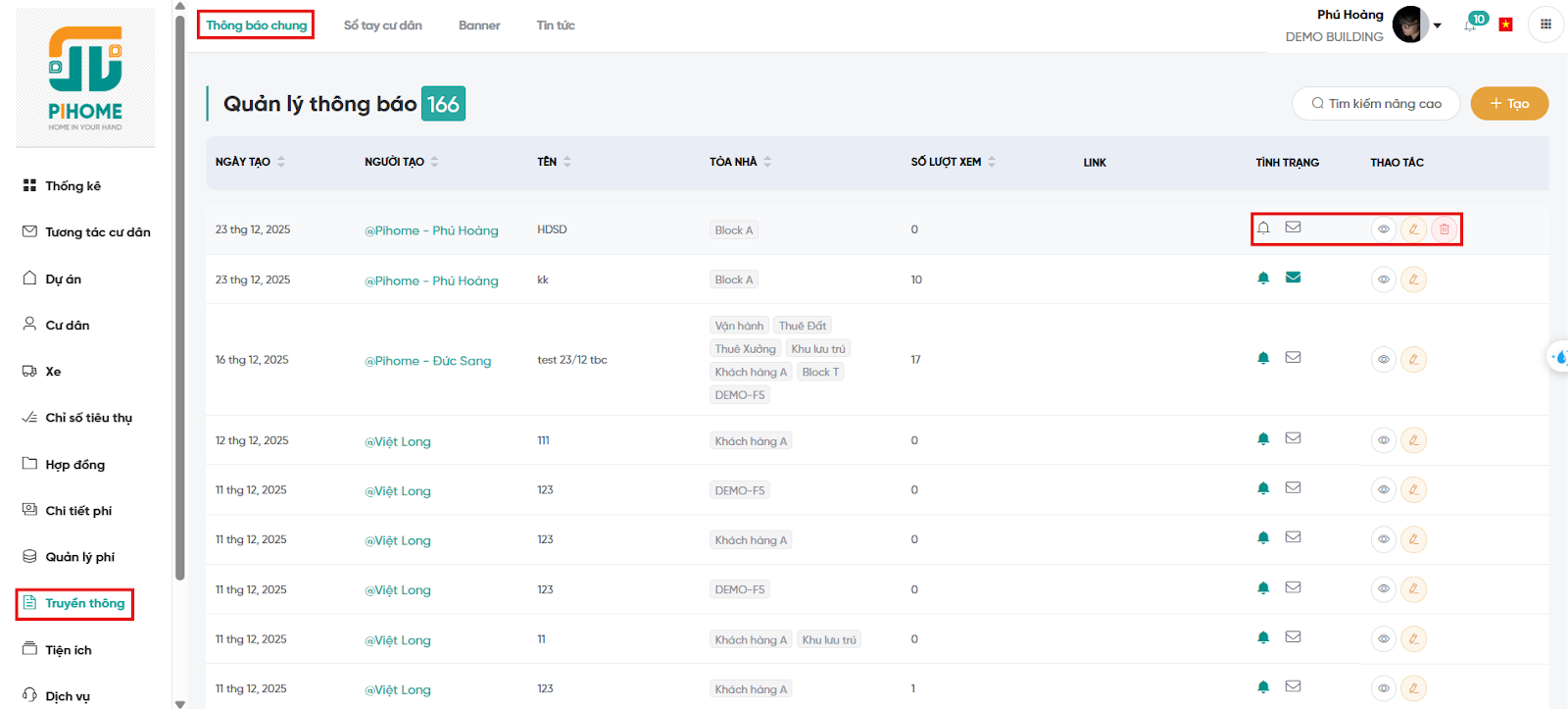 Người dùng có thể gửi đến cư dân qua app/email bằng chọn biểu tượng cái chuông/lá thư tại cột “Tình trạng”.