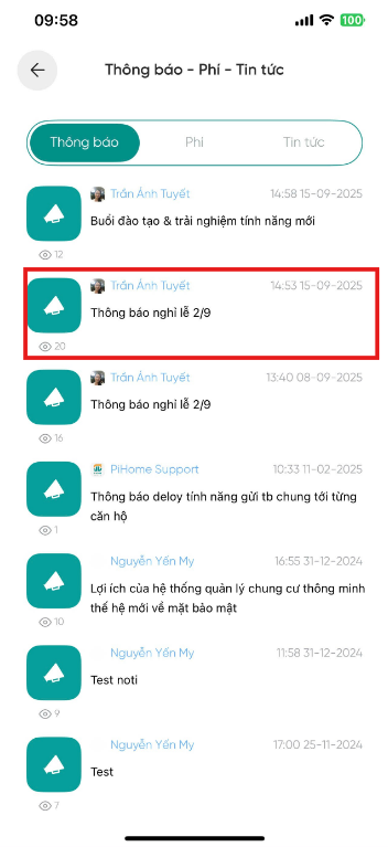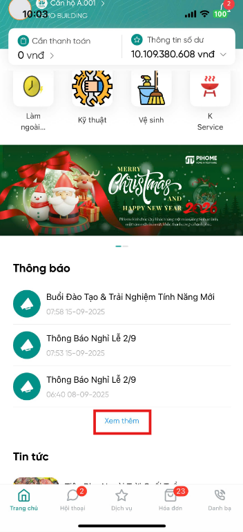 Sau khi nhấn “Xem thêm”, cư dân sẽ thấy danh sách thông báo.