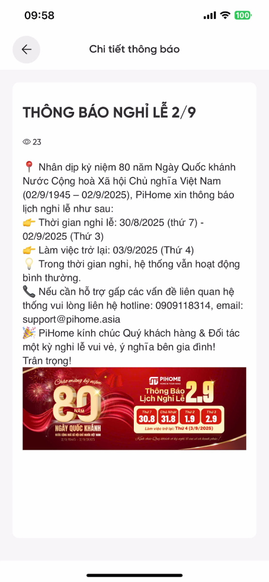 Người dùng có thể nhấn vào thông báo để xem chi tiết thông tin “Thông báo” đó.