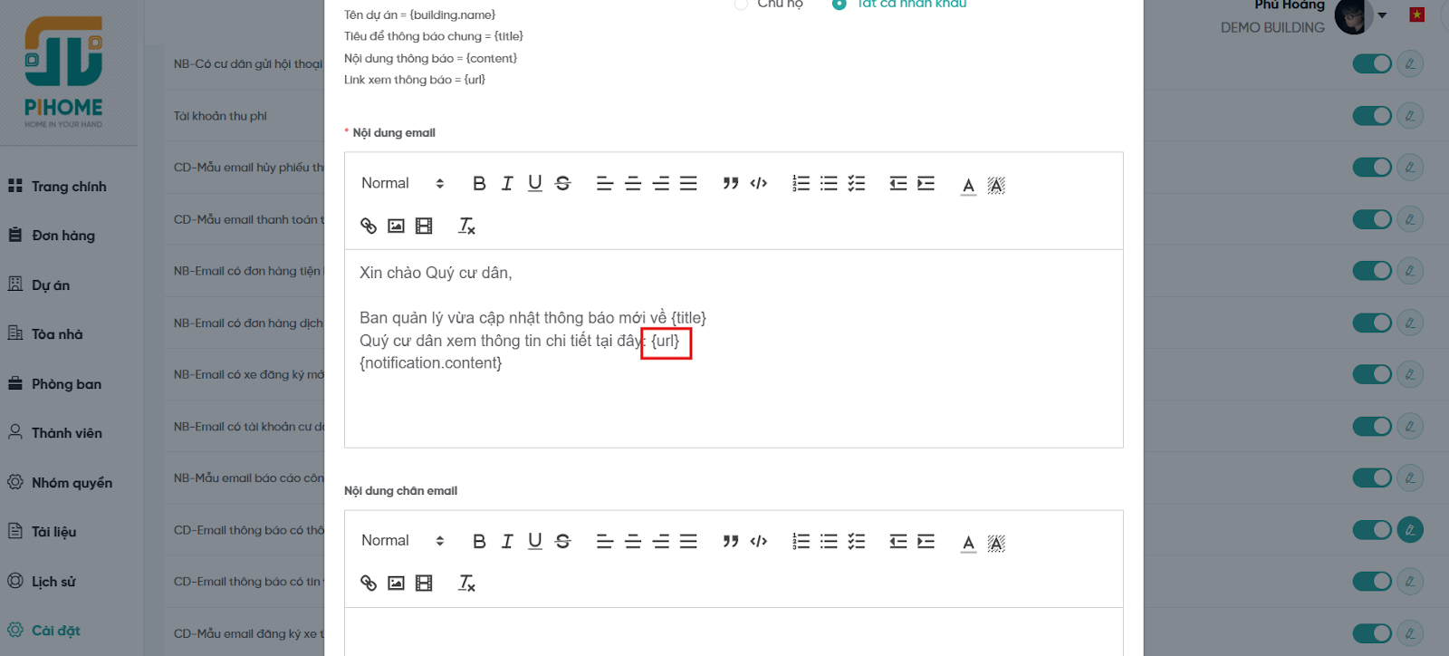Tại phân hệ Quản trị → Cài đặt → Tại mục “CD-Email thông báo có thông báo mới” → Chỉnh sửa → Tại “Nội dung email” → xóa dòng chữ “{url}”