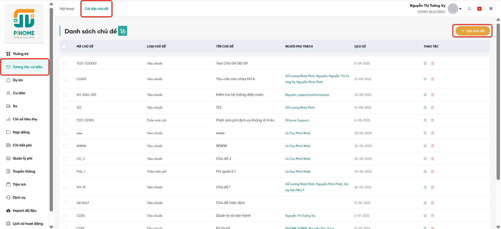 Chức năng Tạo chủ đề trong phân hệ Tương tác cư dân hỗ trợ Ban quản lý thiết lập các nhóm chủ đề nhằm tiếp nhận và xử lý phản ánh từ cư dân.