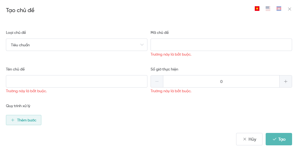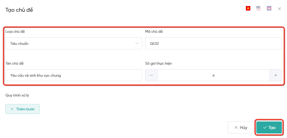 Mỗi chủ đề bao gồm bốn thông tin cơ bản: Mã chủ đề, Tên chủ đề, Số giờ thực hiện và Loại chủ đề. Bên cạnh đó, quản lý có thể thiết lập thêm quy trình xử lý riêng cho từng chủ đề để đảm bảo phù hợp với thực tế vận hành.