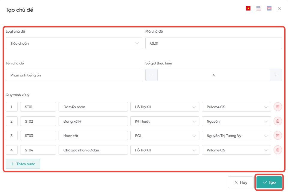 Người dùng nhấn Tạo để lưu chủ đề hoặc nhấn Hủy để thoát mà không lưu.