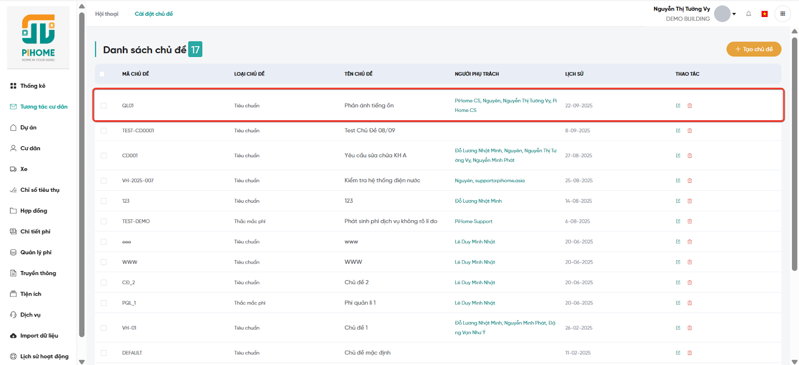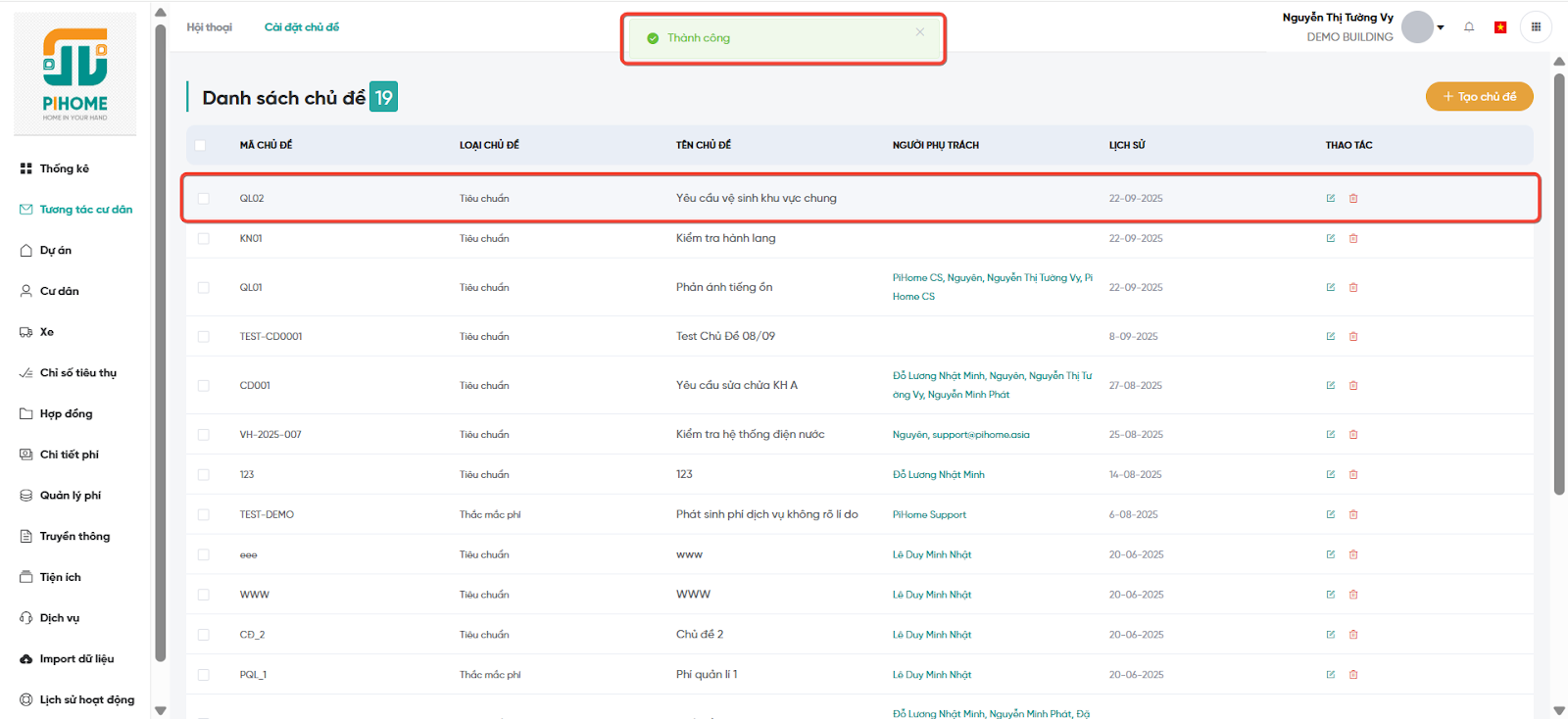 Sau khi tạo thành công, tại màn hình Danh sách chủ đề sẽ hiển thị thêm dòng thông tin về chủ đề mới. Chủ đề này sẽ được dùng để gán khi cư dân tạo mới hội thoại.